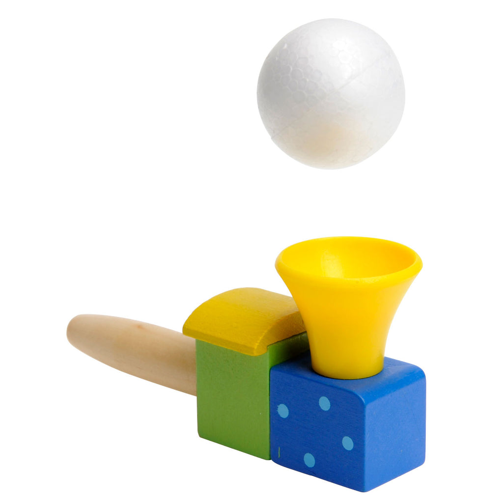 Blaas op het houten treintje en houd het balletje zwevend in de lucht. Verschillende uitvoeringen van dit blaasspel worden door elkaar geleverd.