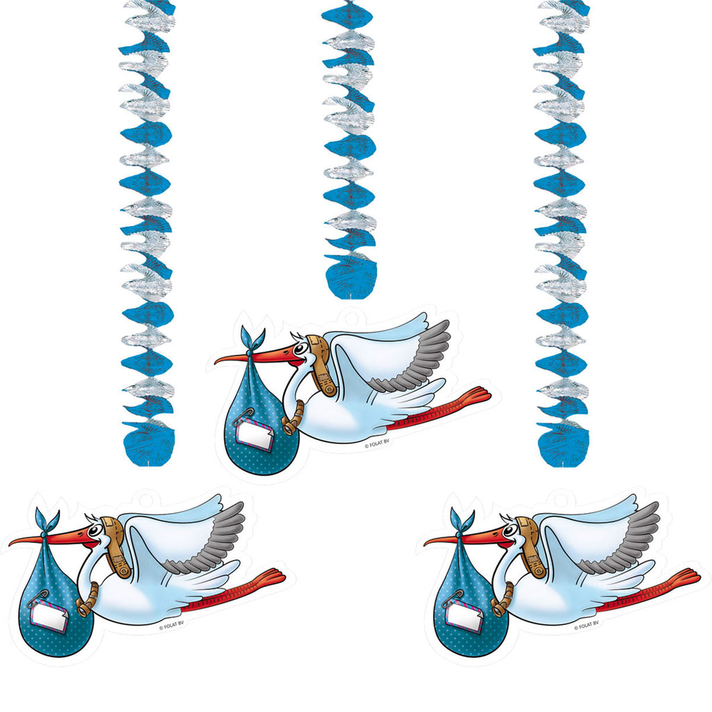 Set van 3 blauwe decospiralen met onderaan een ooievaar.