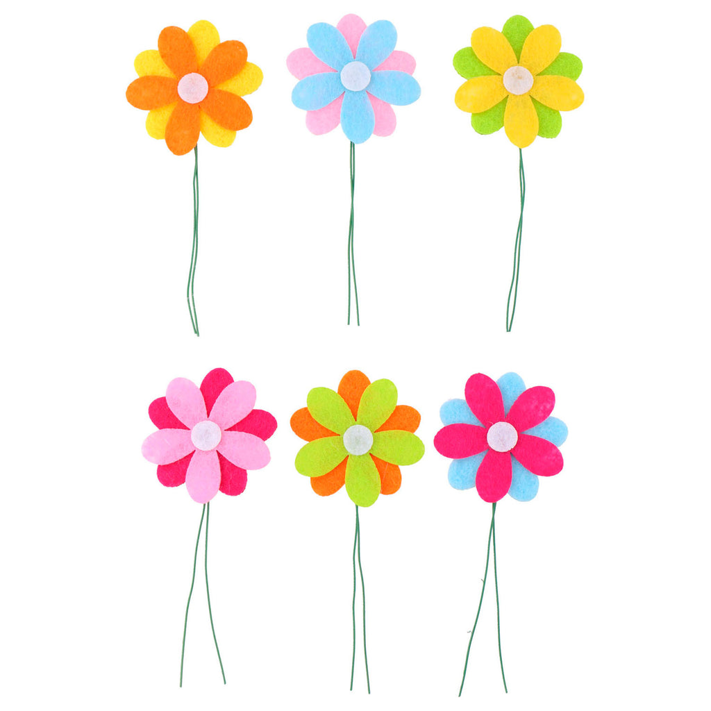 In deze knutselset zitten bloemen met verschillende kleuren op een stokje. Gebruik de bloemen als decoratie in je knutselwerkje of zet ze in een potje in de vensterbank! In het zakje zitten 6 stuks.