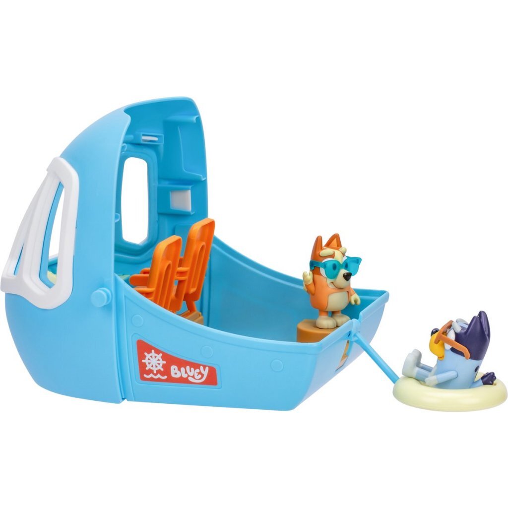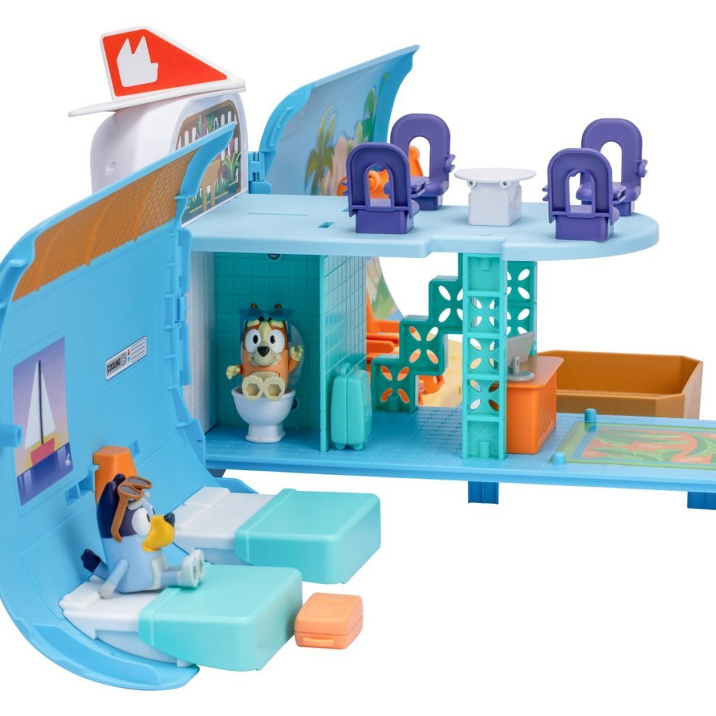 Deze ongelooflijke speelset verandert gemakkelijk van een vliegtuig in een vakantieresort met een boot. Piloot Bluey heeft haar pilotenhoed al op en neemt plaats in de cockpit. Bingo zit heerlijk acherin en is klaar voor de vlucht, daar gaan ze! Beleef allerlei vakantieavonturen met de 15 accessoires, zoals een kofferset, computer, zonnebrillen en nog veel meer! Open de romp van het vliegtuig en ontdek een enorme speelset van 70 cm breed met twee verdiepingen en veel ruimtes om te verkennen, zoals een hotellobby, hotelkamer, een strand, een zwembad en een heerlijke hangmat. De cockpit van het vliegtuig verandert in een boot voor nog meer avonturen! De hele speelset komt tot leven met meer dan 25 geluiden en zinnetjes uit de show. Versier de speelset met de stickers op het stickervel. Geschikt voor kinderen vanaf 3 jaar.