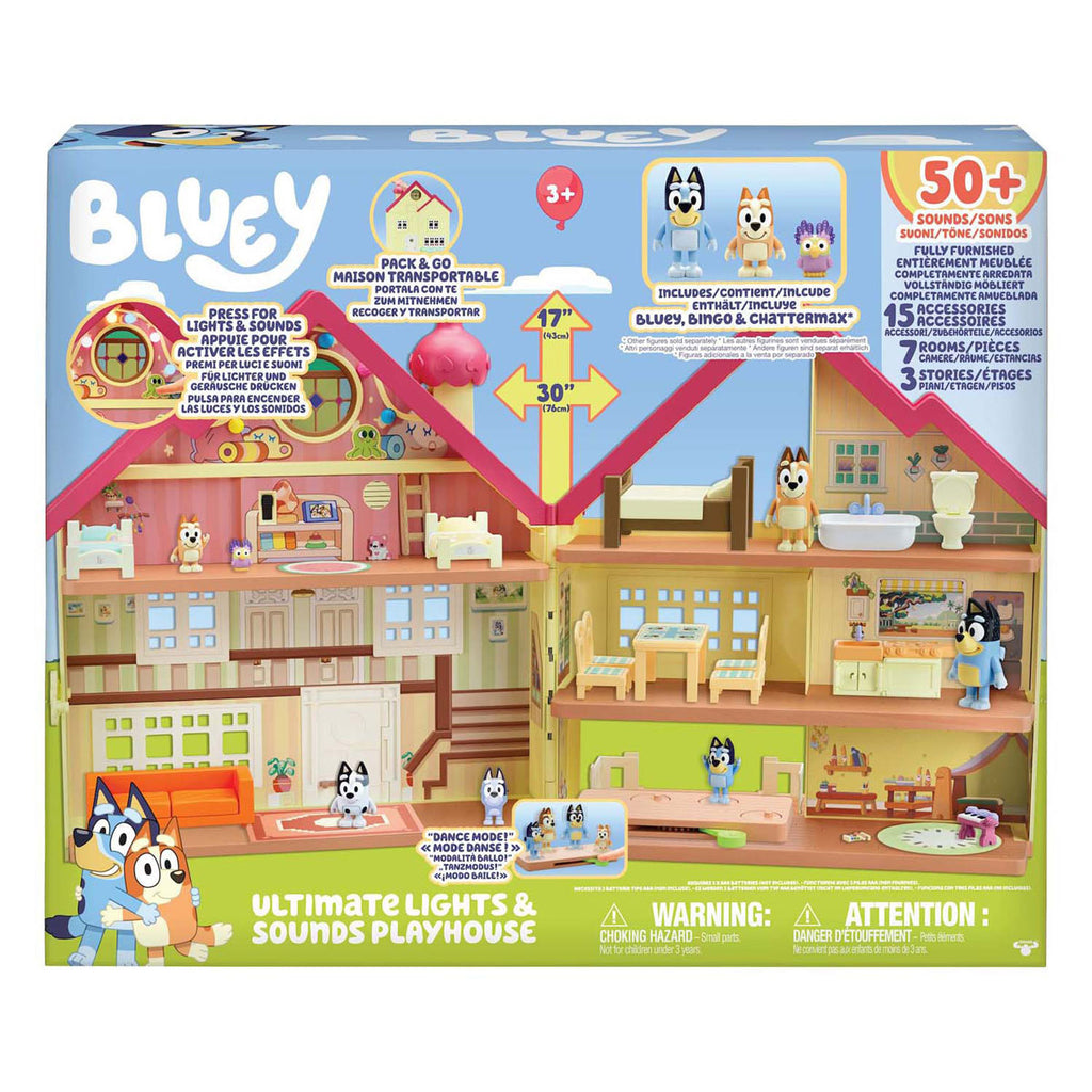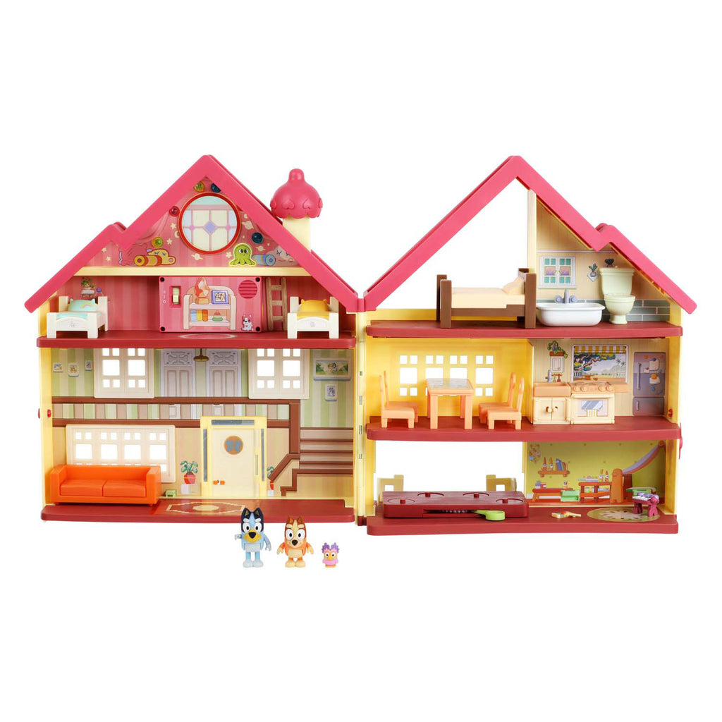 Kijk jij ook altijd naar de avonturen van Bluey? Bluey is een 6 jaar oude Heeler-hond die samen met haar familie de leukste avonturen beleeft. Speel nu zelf met Bluey en haar gezin! Beleef allerlei avonturen in het Ultieme Licht & Geluid Speelhuis van Bluey! Dit enorme speelhuis van wel 43 cm hoog en 76 cm breed kun je open- en dichtklappen. Het heeft ook een voordeur die open en dicht kan en bovenop het dak zie je een schoorsteen.