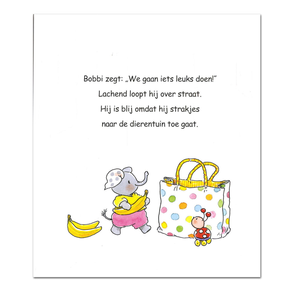 Hé, wat doen die olifanten? Bobbi roept: "Ze gaan in bad." Kijk, die slurf spuit heel veel water. Pas op, Bobbi, je wordt nat! Inhoud: 32 pagina's. Geschikt voor kinderen vanaf 2 jaar.