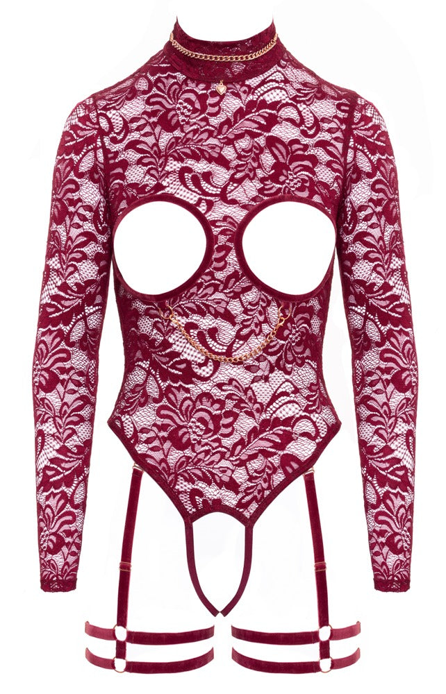 Bourgondisch-rode body met lange mouwen van Abierta Fina met jarretelharnas. Gemaakt van zacht stretch bloemenkant, verleidelijk opgevoerd met fluwelen details en roségoudkleurige sierkettingen. Overal zacht en stretchy voor een hoog draagcomfort. In een onthullend kruisloos model met uitsparingen voor de borsten en een uitnodigend open kruis. Het kanten lijfje verleidt ook met een mooie ronde halslijn op de rug. De hartjuwelenketting aan de voorkant van de opstaande kraag (met haaksluiting) is afneembaar, net als de karabijnketting aan de ringen onder de borsten. De verstelbare jarretelbandjes en dijbeenbandjes kunnen ook van het kanten lijfje worden verwijderd.