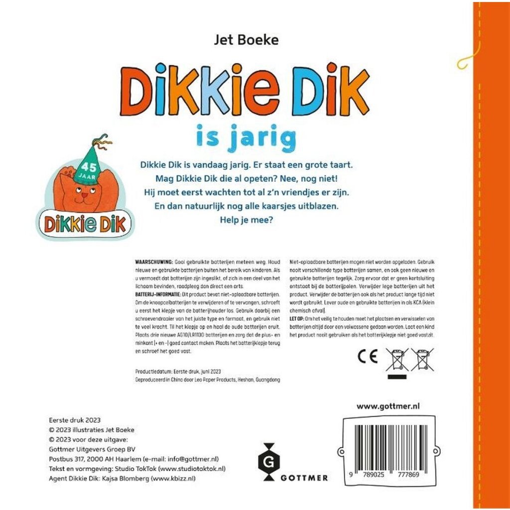 Dikkie Dik is jarig' is een uniek en stevig boek met een verjaardagstaart met drie kaarsjes om echt uit te blazen. En Dikkie Dik wil dan ook niets liever dan die kaarsjes uitblazen en de taart oppeuzelen, maar er moet nog een hoop gebeuren voor het poezenfeestje kan beginnen: de slingers moeten worden opgehangen, alle poezenvrienden moeten nog arriveren... Zou Dikkie Dik zo lang kunnen wachten?