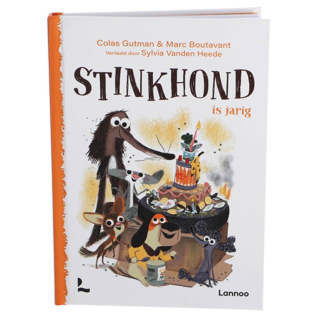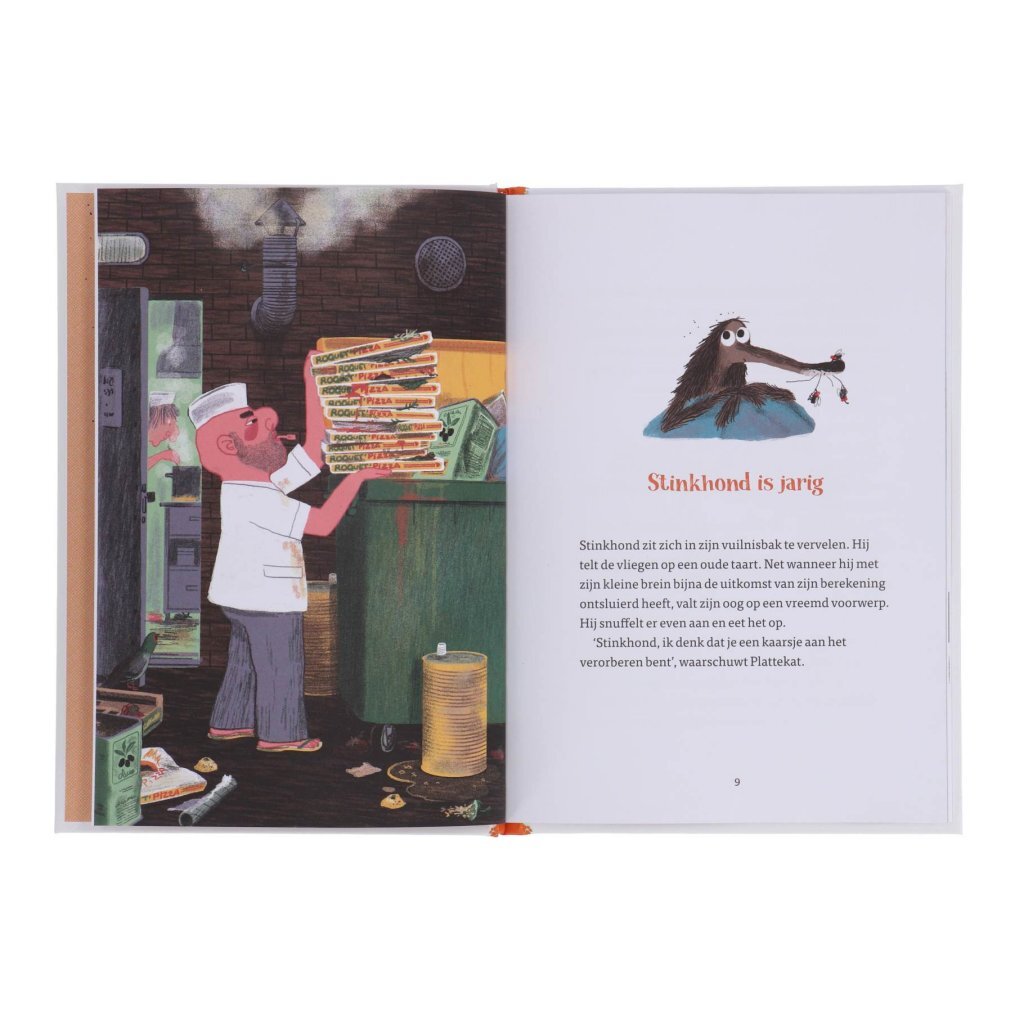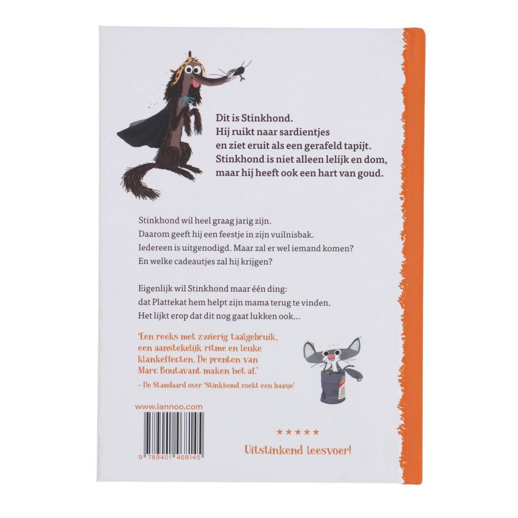 Dit is Stinkhond. Hij ruikt naar sardientjes en ziet eruit als een gerafeld tapijt. Stinkhond is niet alleen lelijk en dom, maar hij heeft ook een hart van goud. Stinkhond wil heel graag jarig zijn. Daarom geeft hij een feestje in zijn vuilnisbak. Iedereen is uitgenodigd. Maar zal er wel iemand komen? En welke cadeautjes zal hij krijgen? Eigenlijk wil Stinkhond maar één ding: dat Plattekat hem helpt zijn mama terug te vinden. Het lijkt erop dat dit nog gaat lukken ook... 88 pagina's. Geschikt voor kinderen vanaf 6 jaar.