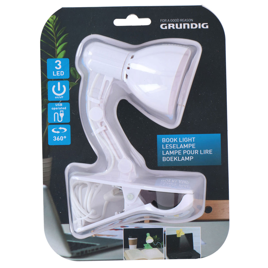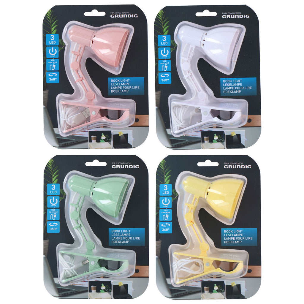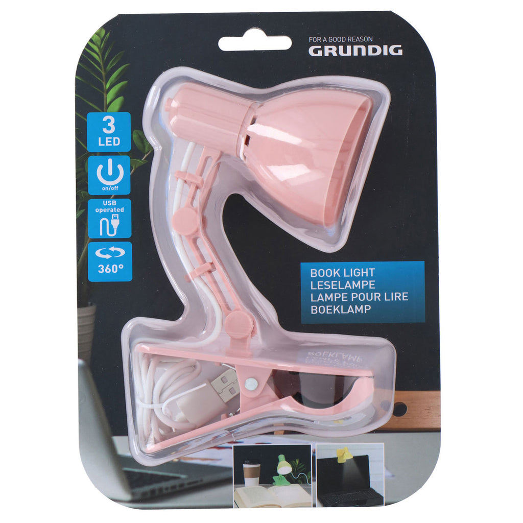 Boek lampje van Grundig. Het lampje kan 360 graden draaien. Klem het pastelkleurige lampje aan je bed, boek of pennenbakje. Inclusief USB-kabel.