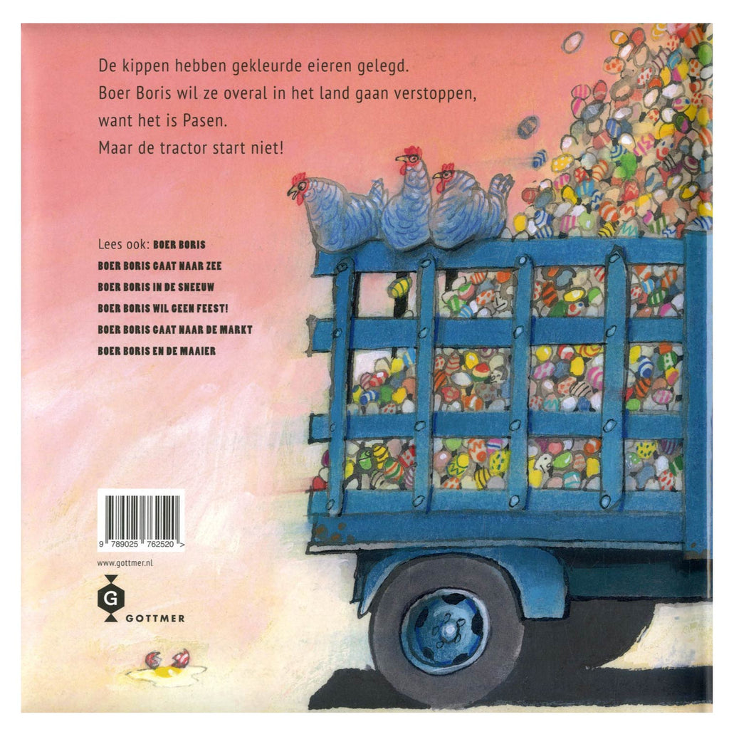 'Boer Boris en de eieren' is een perfect prentenboek voor Pasen. De kippen hebben extra hun best gedaan om vrolijke, gekleurde eieren te leggen. Boris laadt ze op de trekker om ze te verstoppen door het héle land en de kippen gaan gezellig mee. Maar na een bijna-botsing met de paashaas zijn alle eitjes stuk. Van schrik leggen de kippen opnieuw een ei, maar niet zo mooi gekleurd helaas. Er moet gauw iets gebeuren - hoe komen ze aan kleuren?