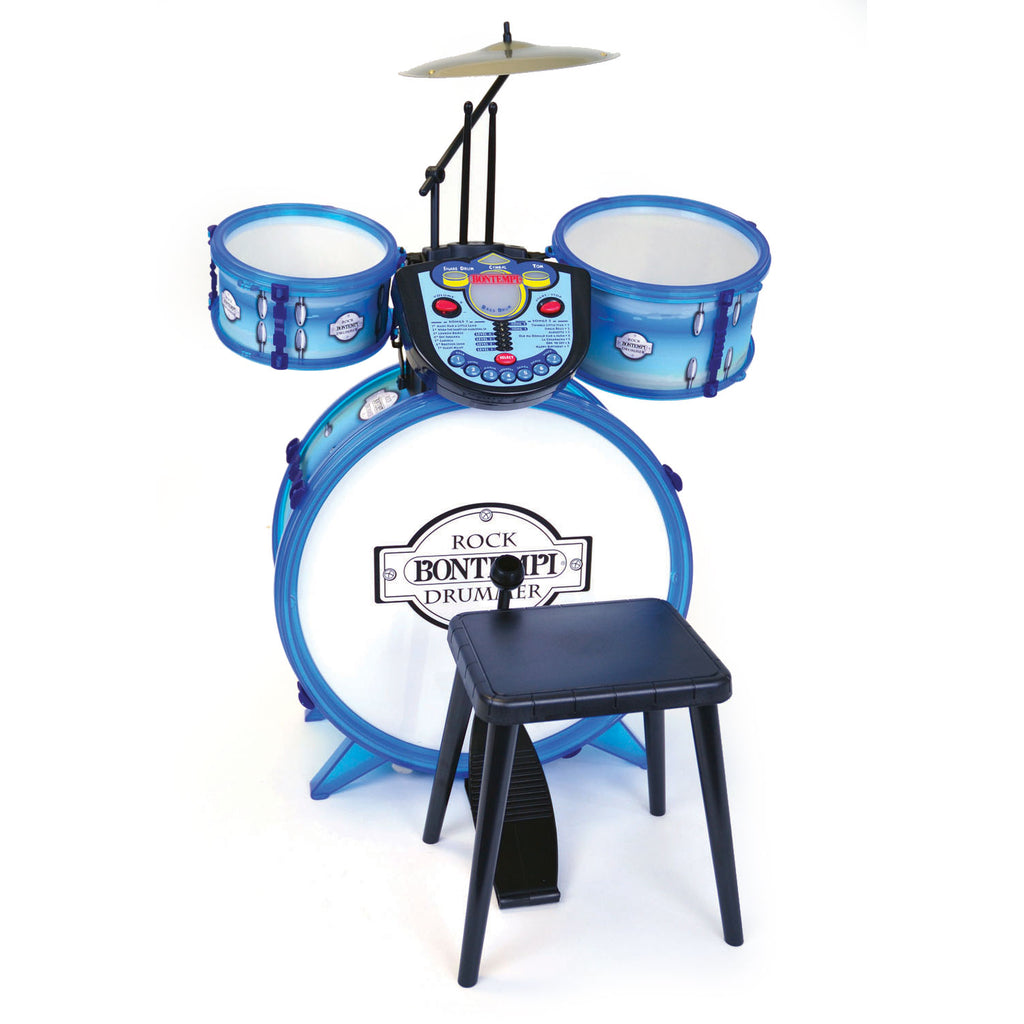 Speel de gaafste ritmes met dit Drumstel van Bontempi. Sla met de drumstokken op de trommels en bekken en maak er een echte show van. Het drumstel geeft echte realistische geluiden en heeft ook een elektronisch paneel voor nog meer muziekplezier. Met het elektronisch paneel kun je met 7 ritmes en 14 voorgeprogrammeerde liedjes meespelen. Ook zijn er 4 leerniveaus en geven licht en geluid het ritme aan. Inclusief krukje, 2 drumstokken, 3 trommels, 1 bekken en 1 pedaal. Werkt op 3 AA batterijen (niet inbegrepen).