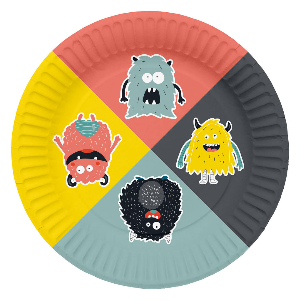 Borden Monster Bash 23cm - 8 stuks. Inhoud: 8 borden. Kleur: Meerkleurig. Het bord heeft een diameter van 23 cm en is gemaakt van FSC®-gecertificeerd papier.