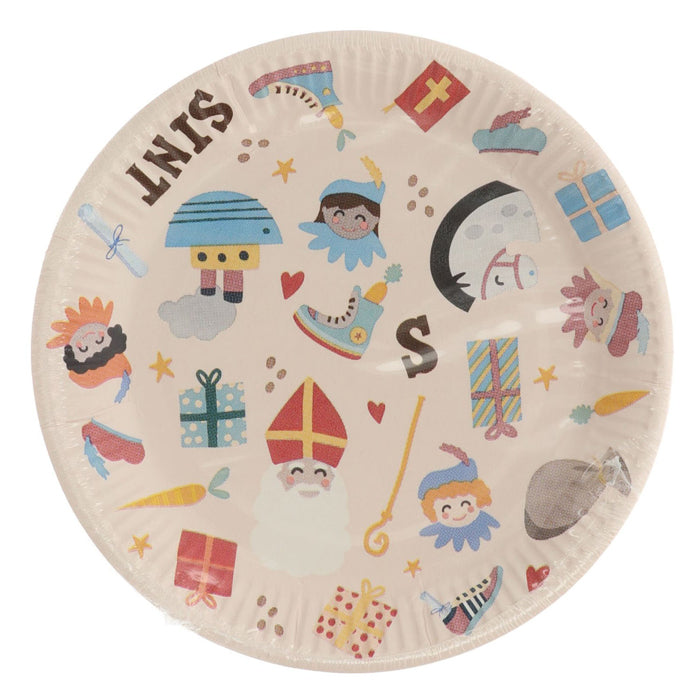 Al het lekkers wordt extra lekker op deze vrolijke Sinterklaas (eet)borden uit de 2023 collectie "Sint en Pieten". De borden hebben een diameter van 18 cm en zitten per 8 stuks verpakt. Dit artikel is gemaakt van papier.