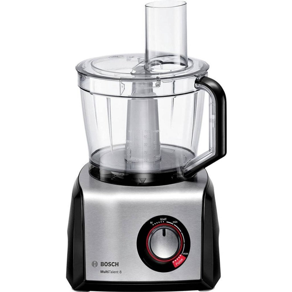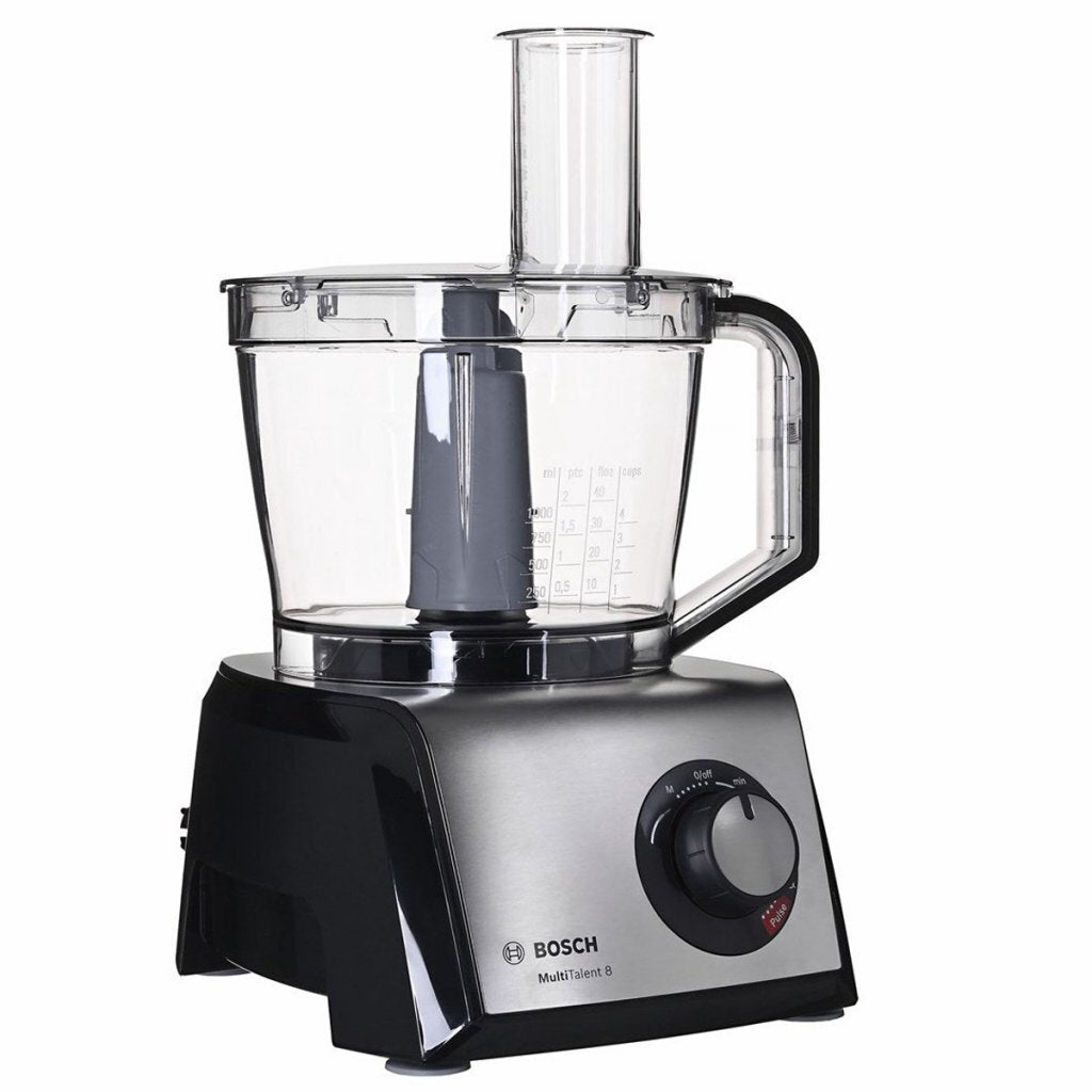 De Bosch MC812M865 MultiTalent 8 keukenmachine neemt je het werk uit handen. Met de MultiTalent 8 kun je eenvoudig hakken, versnipperen, snijden, mixen, pureren, deeg mengen en room kloppen. Deze Bosch MultiTalent 8 is voorzien van een 1250 watt vermogen, een traploze instelbare snelheid en een gebruikerscapaciteit van 1,5 kg.