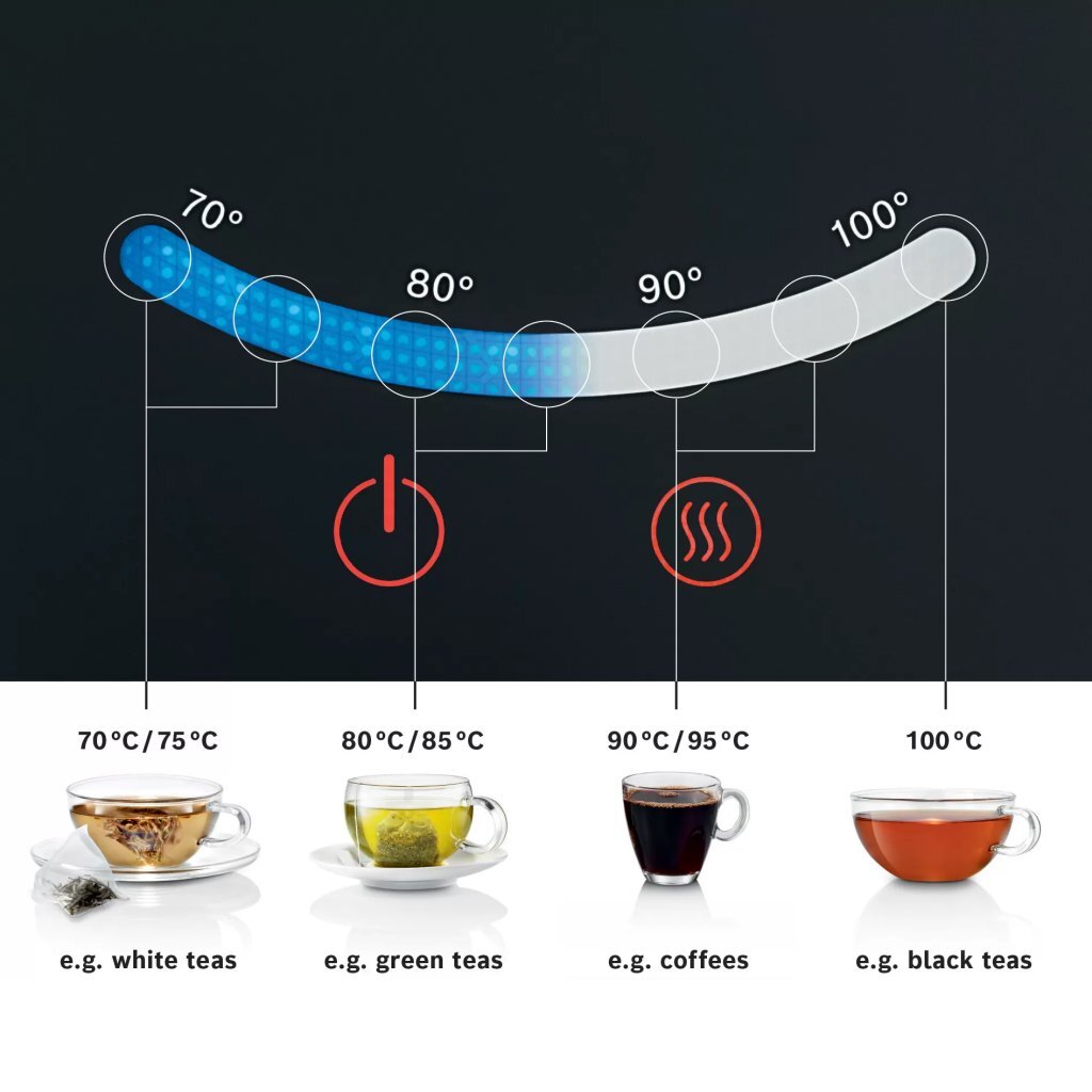 - Elke kop thee vraagt om een specifieke temperatuur zodat het aroma het best tot zijn recht komt. Met de TemperatureControl7 stel je de juiste temperatuur in voor je thee. Kies uit de zeven niveaus: 70 °C, 75 °C, 80 °C, 85 °C, 90 °C, 95 °C en 100 °C. Zo geniet je wanneer je maar wilt van een heerlijk kop thee.
