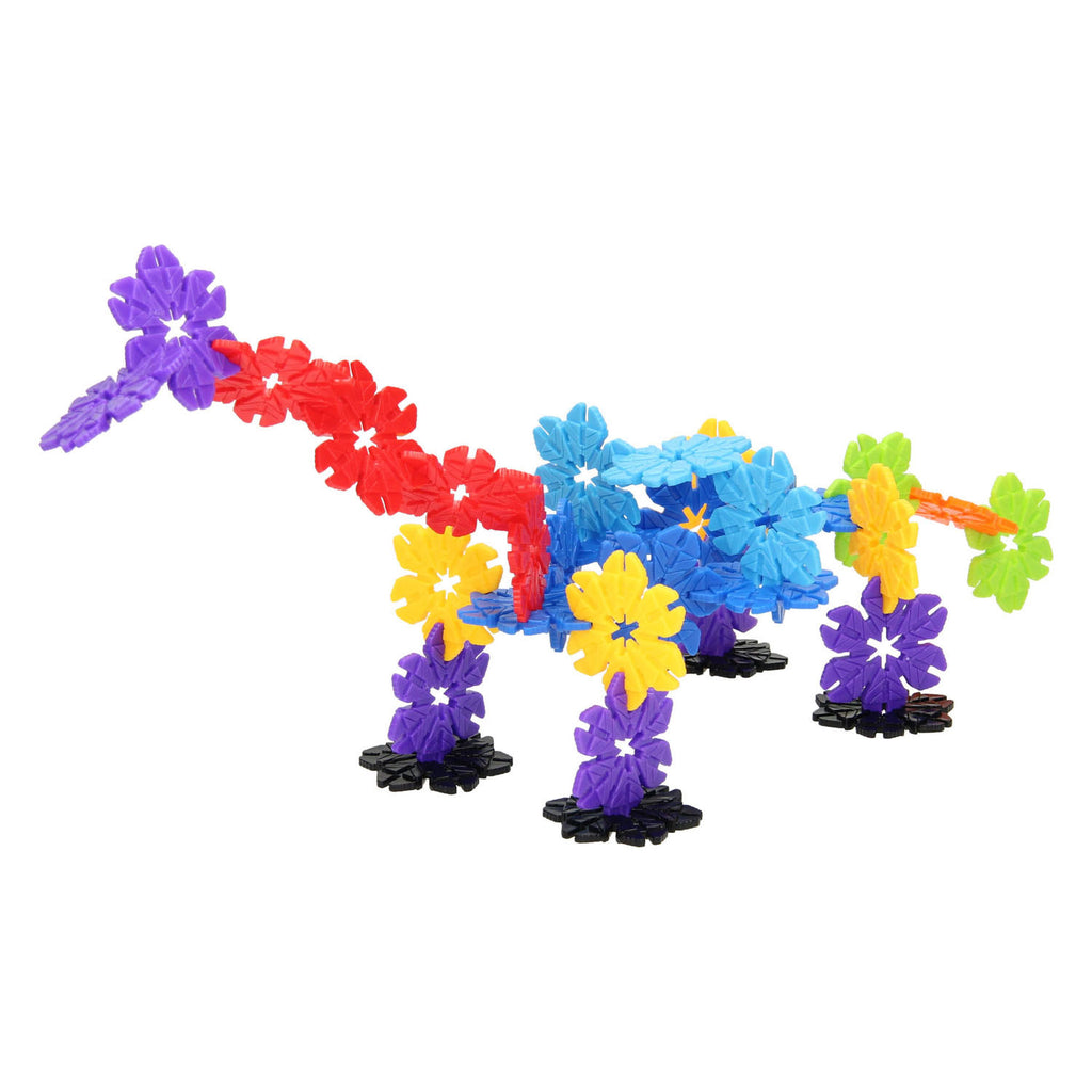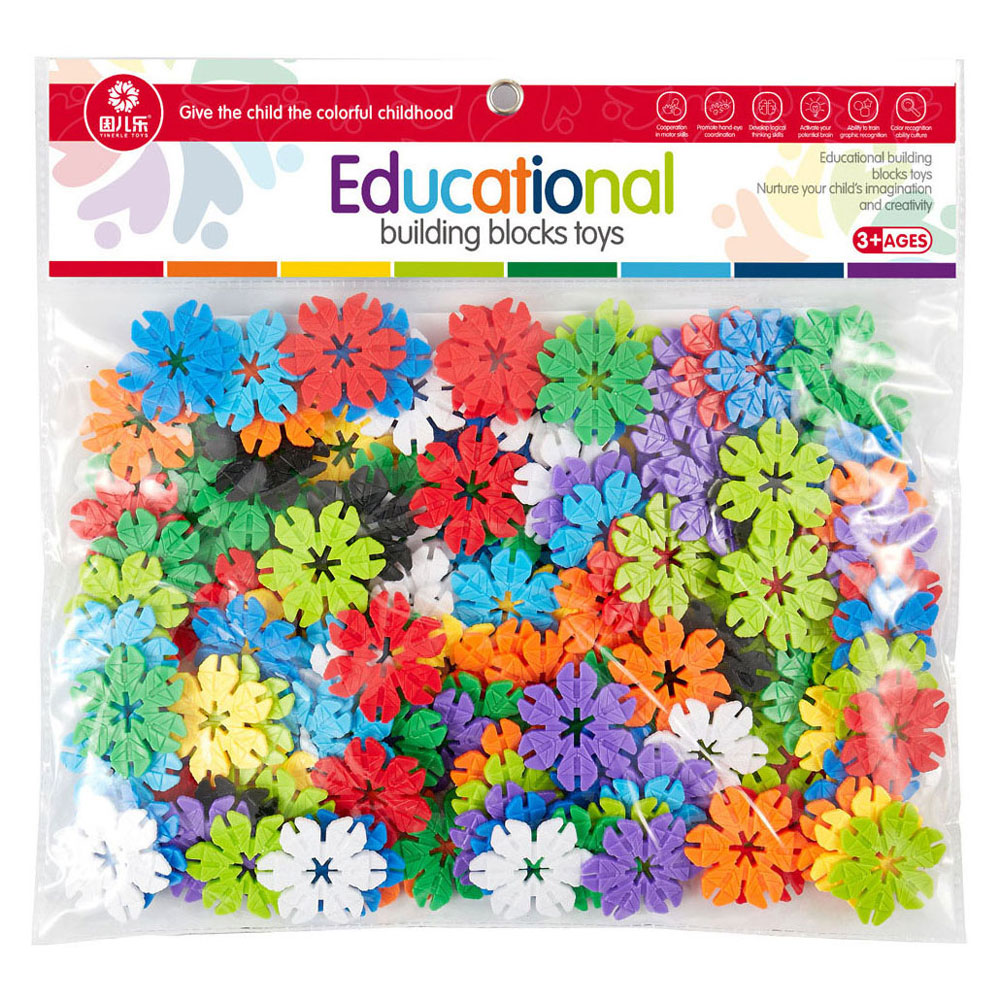 Set van 140 kunststof bouwschijfjes in bloemvorm (4,5cm) met inkepingen rondom. Inclusief voorbeelden. Geschikt vanaf 3 jaar.