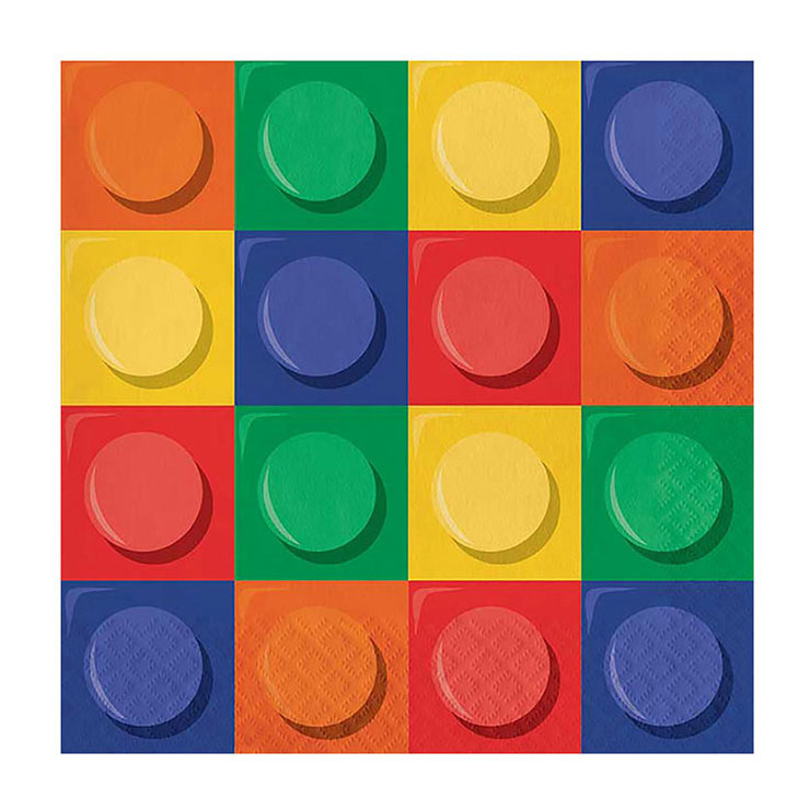 Papieren servetten met bouwblokjesprint. De servetten hebben een uitgevouwen maat van 33x33cm en zitten per 16 stuks verpakt.