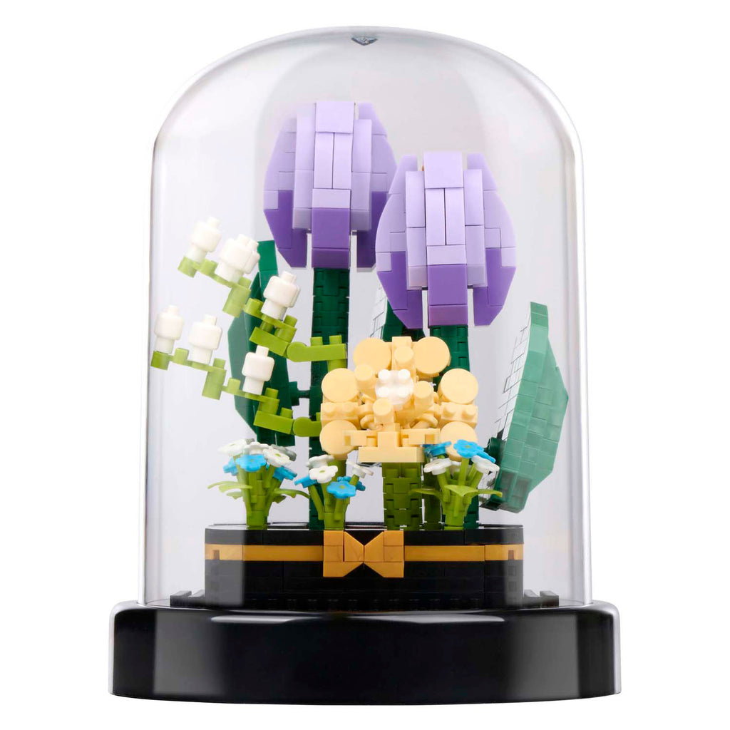Display met bloemen van bouwstenen. Ideaal ter decoratie, deze sets hebben heldere kleuren en een elegante afwerking onder een glazen stolpje. Perfect voor creatieve bouw- en decorliefhebbers.