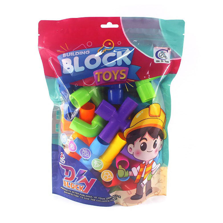 Zakje met kunststof bouwbuisjes die eenvoudig aan elkaar te klikken zijn. O.a. rechte buisjes, T-splitsingen, kruizen en bochten. Afmetingen zak: 21 x 28 centimeter. Geschikt voor kinderen van 3 jaar en ouder.