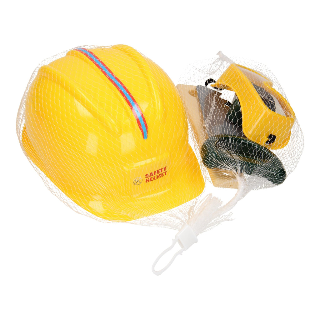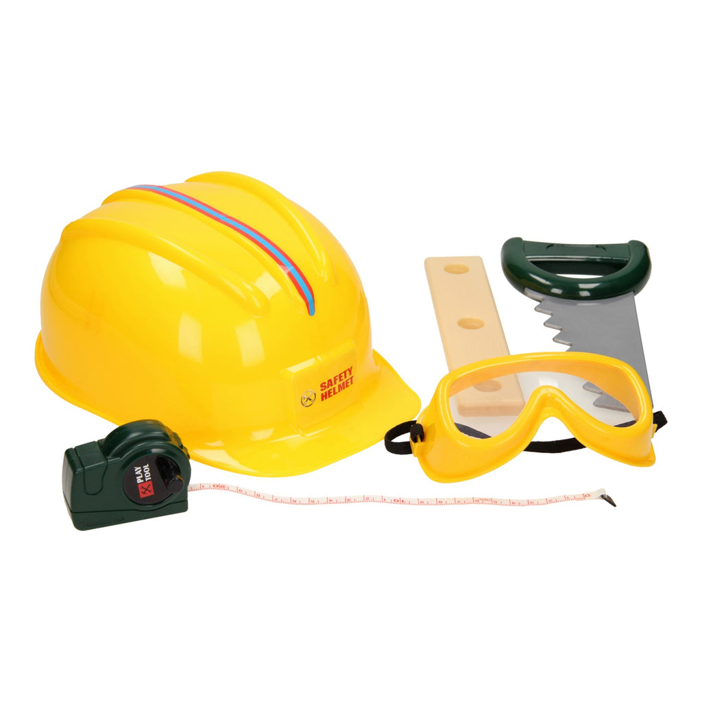Ga bouwen met deze set! Bescherm jezelf met de bouwhelm en de veiligheidsbril en ga klussen met het gereedschap. Met een meetlint, de waterpas en de zaag, kun je elke klus aan! Gemaakt van kunststof.