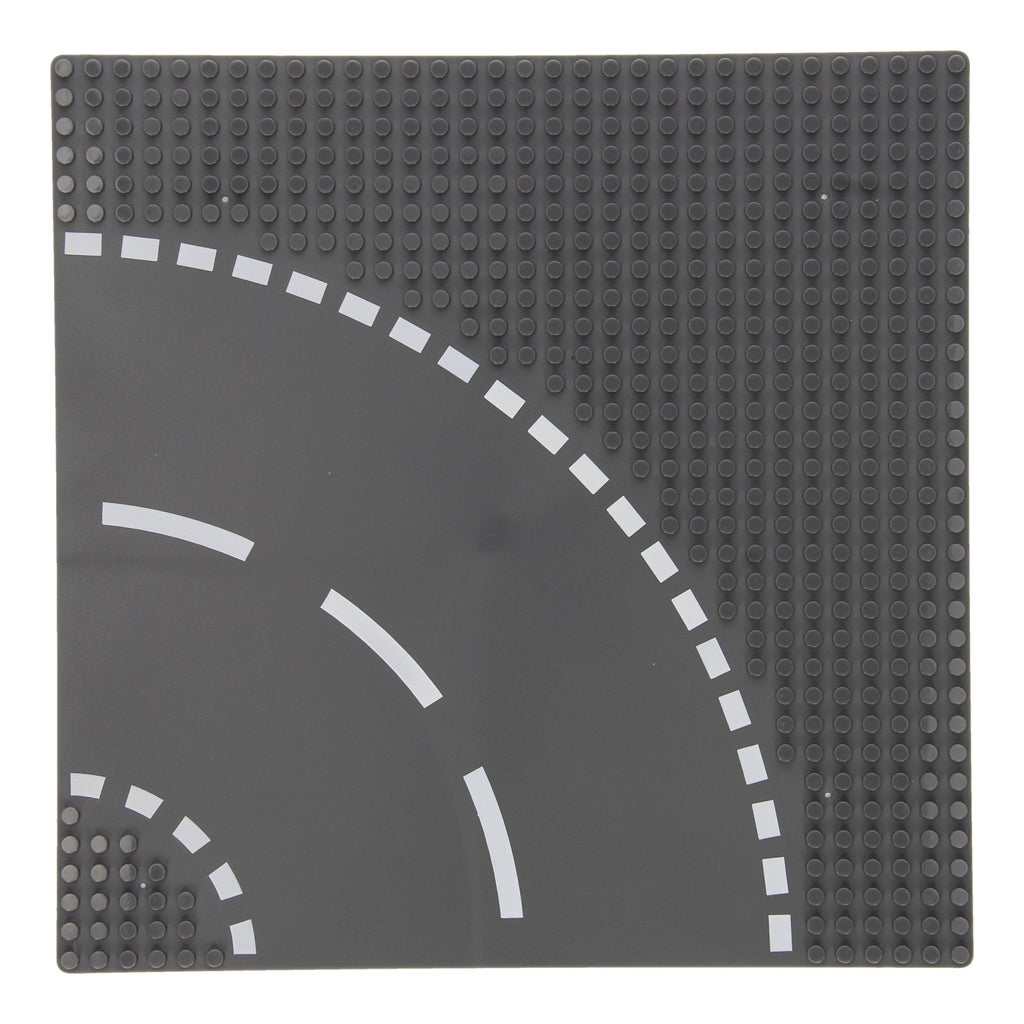 Breid je wegennetwerk uit met deze bouwplaat met bocht. Je kunt op de noppen naast de weg nog mooie bouwwerken bouwen. Bouwplaat is 25 bij 25 centimeter. Gemaakt van kunststof. Geschikt voor de bouwblokken van bekende merken.