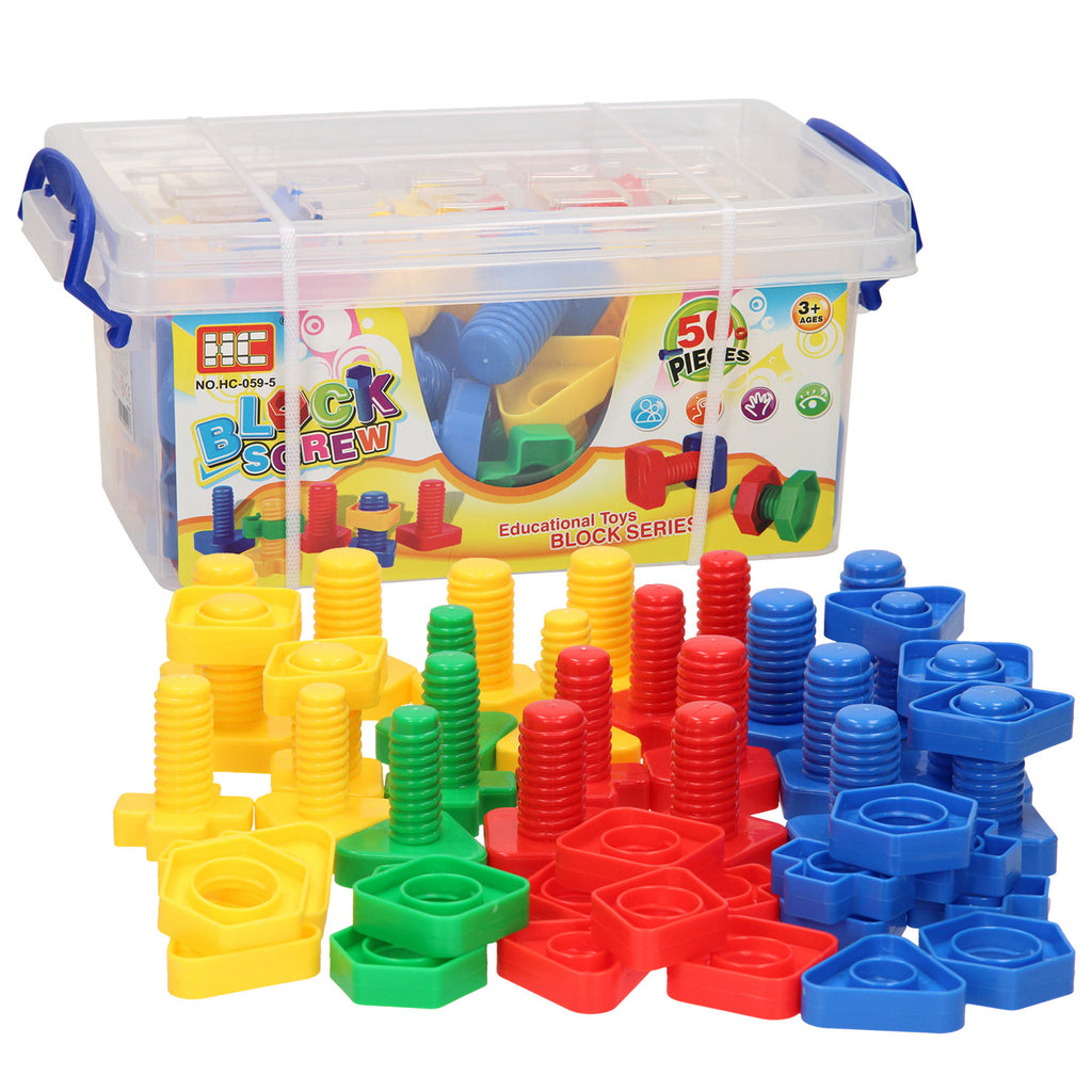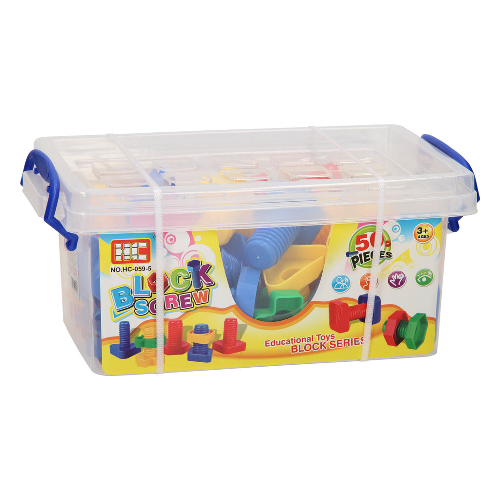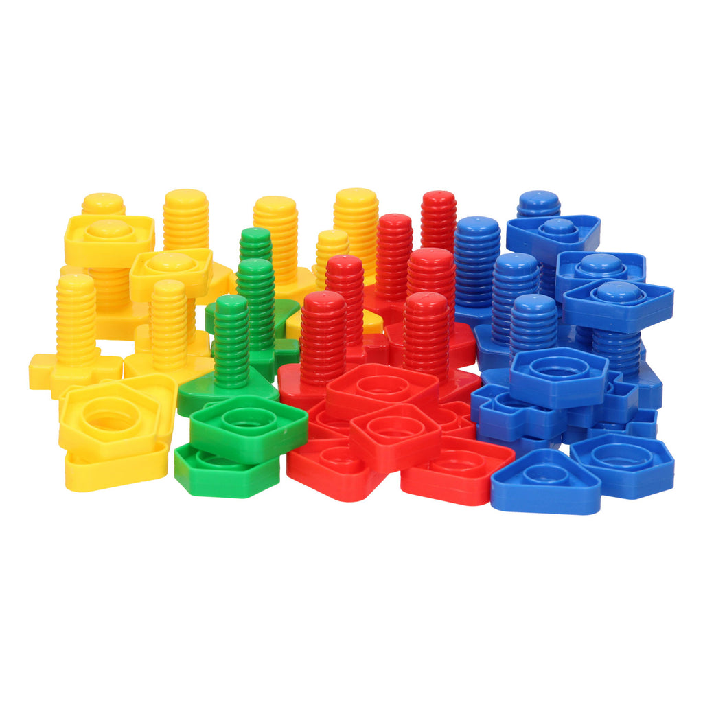 Deze bouwschroeven zijn naast vrolijk gekleurd ook nog eens super leerzaam. Door de moeren op de bouten te draaien wordt de fijne motoriek en het concentratievermogen gestimuleerd. Ook leren kinderen op deze manier kleuren en vormen herkennen. De bouwschroeven zitten in een handige kunststof bak. Geschikt vanaf 3 jaar.