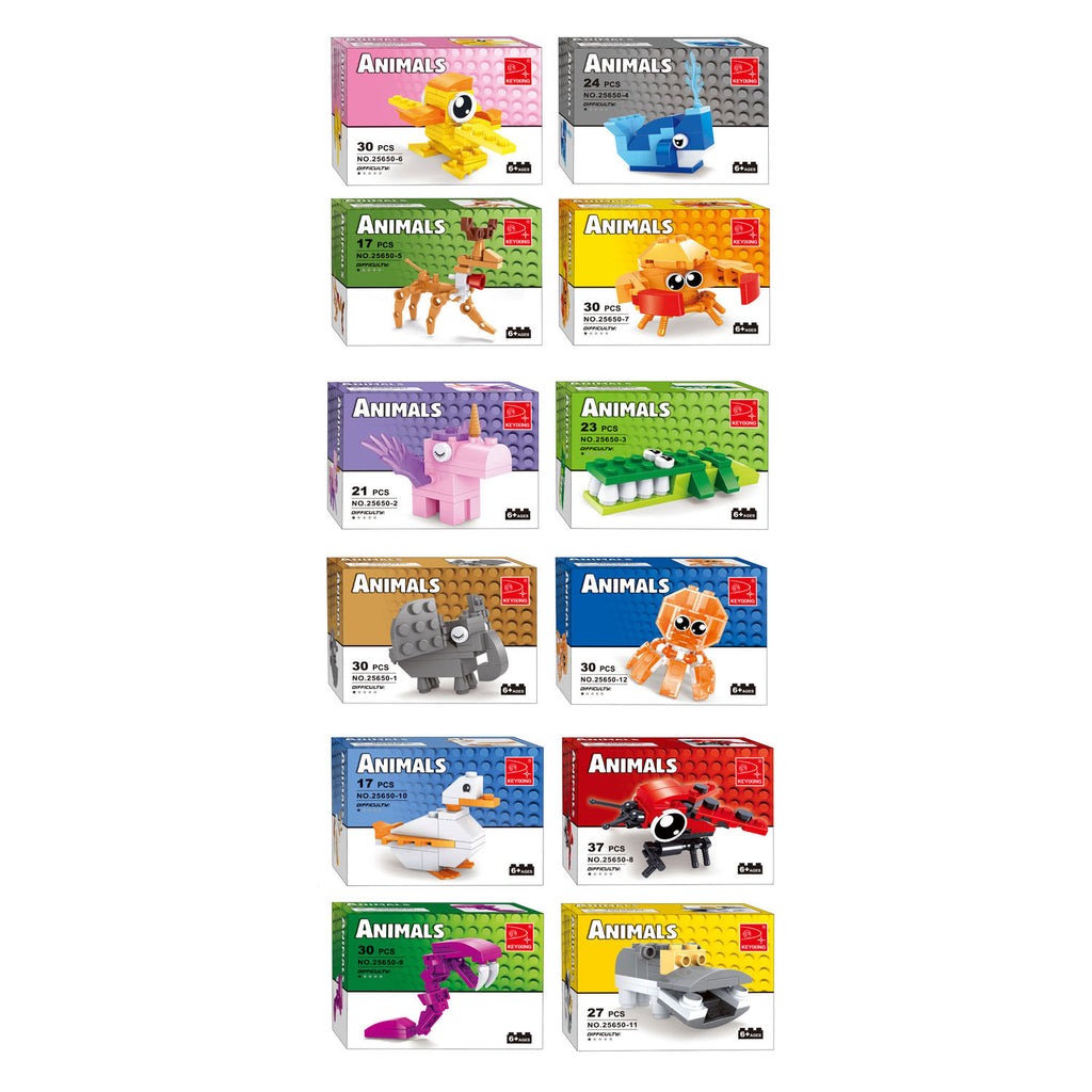 Bouwset van verschillende dieren om uit te delen. Je krijgt de volgende dieren: olifant, eenhoorn, krokodil, walvis, rendier, eend, krab, lieveheersbeestje, slang, zwaan, nijlpaard en octopus. Geschikt voor kinderen vanaf 6 jaar.