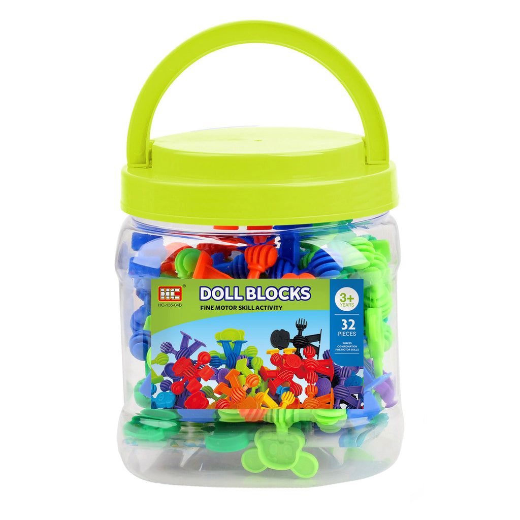Kunststof opbergbox met 32 bouwvormen van poppetjes met dierengezichten. Geschikt voor kinderen vanaf 3 jaar.