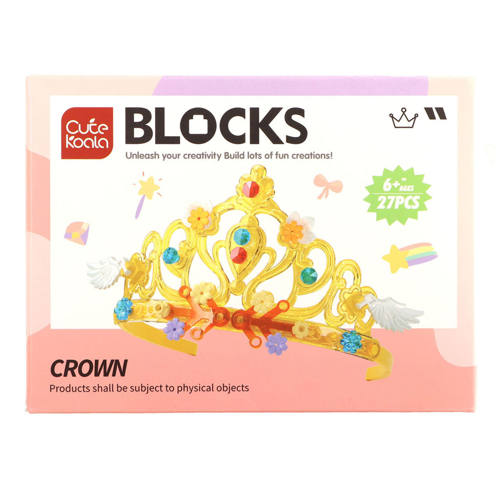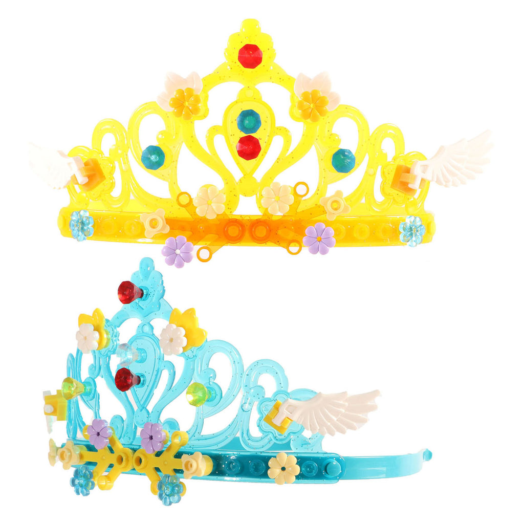 Transparante DIY-kroon om zelf te versieren met 27 bouwsteentjes. In goud of blauw, beide met een transparante kunststof robijn. Geschikt vanaf 6 jaar.