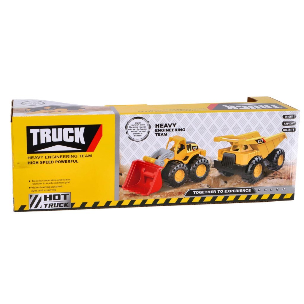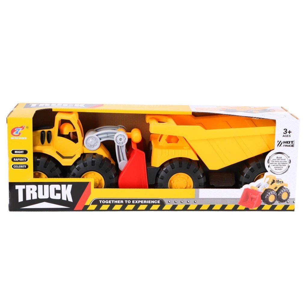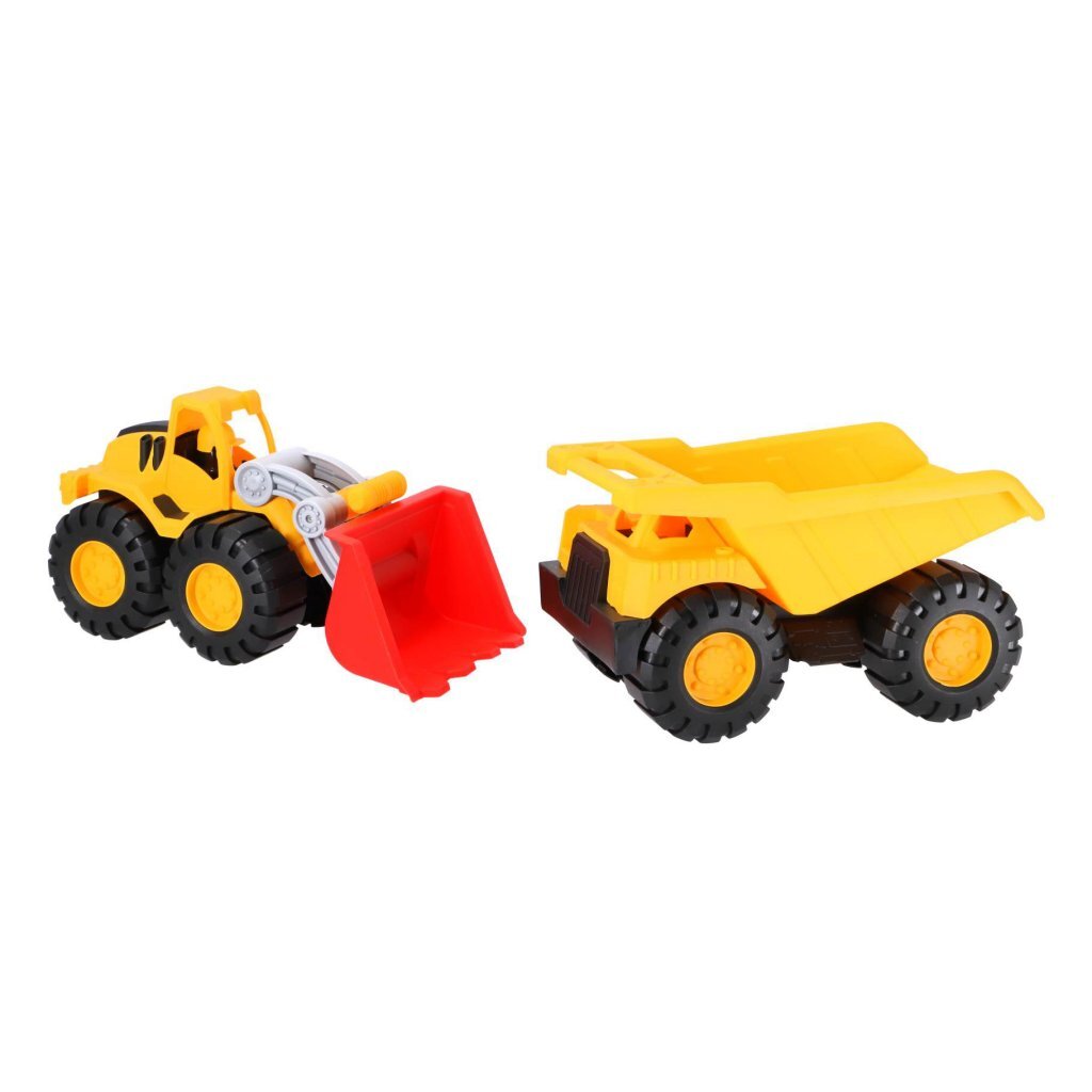 Twee stevige bouwvoertuigen: een kiepwagen en een graafmachine met beweegbare arm. Gemaakt van stevig kunststof. De wagens zijn ongeveer 25 cm groot. Geschikt voor kinderen vanaf 3 jaar.
