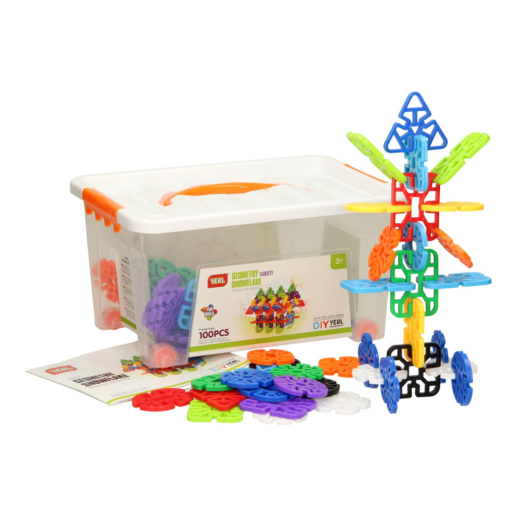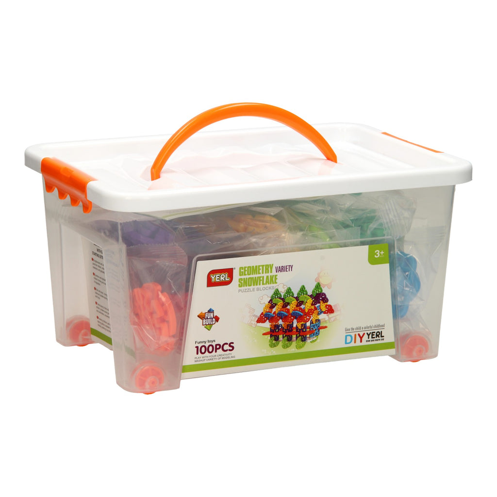 Met deze kleurrijke kunststoffen Bouwvormen kun je eindeloos figuren bouwen. Een auto, een raket of een vliegtuig, steek de 100 stevige bouwvormen in elkaar en bouwen maar. Stimuleer de hand-oog coördinatie en leer verschillende kleuren en vormen met deze bouwset. Wanneer je klaar bent met bouwen kun je de bouwvormen opbergen in de handige bijgeleverde Opbergbox op wielen met handvat. Geschikt vanaf 3 jaar.