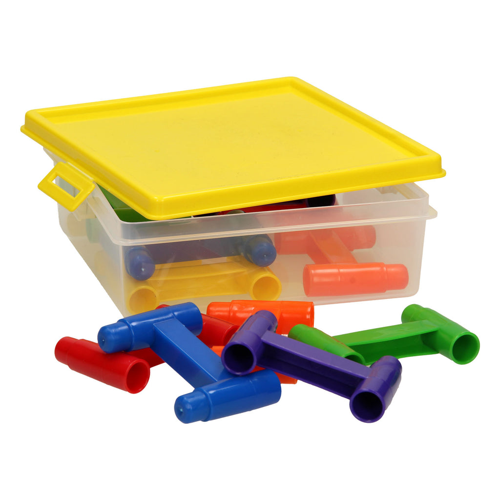 Kinderen zullen veel plezier beleven aan deze kleurrijke ladder bouwvormen in een handige Opbergbox. Door deze bouwonderdelen op elkaar te stapelen kunnen kinderen (fantasie)figuren maken. De bouwvormen zijn gemaakt van veilig en afwasbaar kunststof materiaal en zijn gemakkelijk in gebruik. In de opbergbox zitten 12 bouwelementen. Geschikt voor kinderen vanaf 18 maanden.