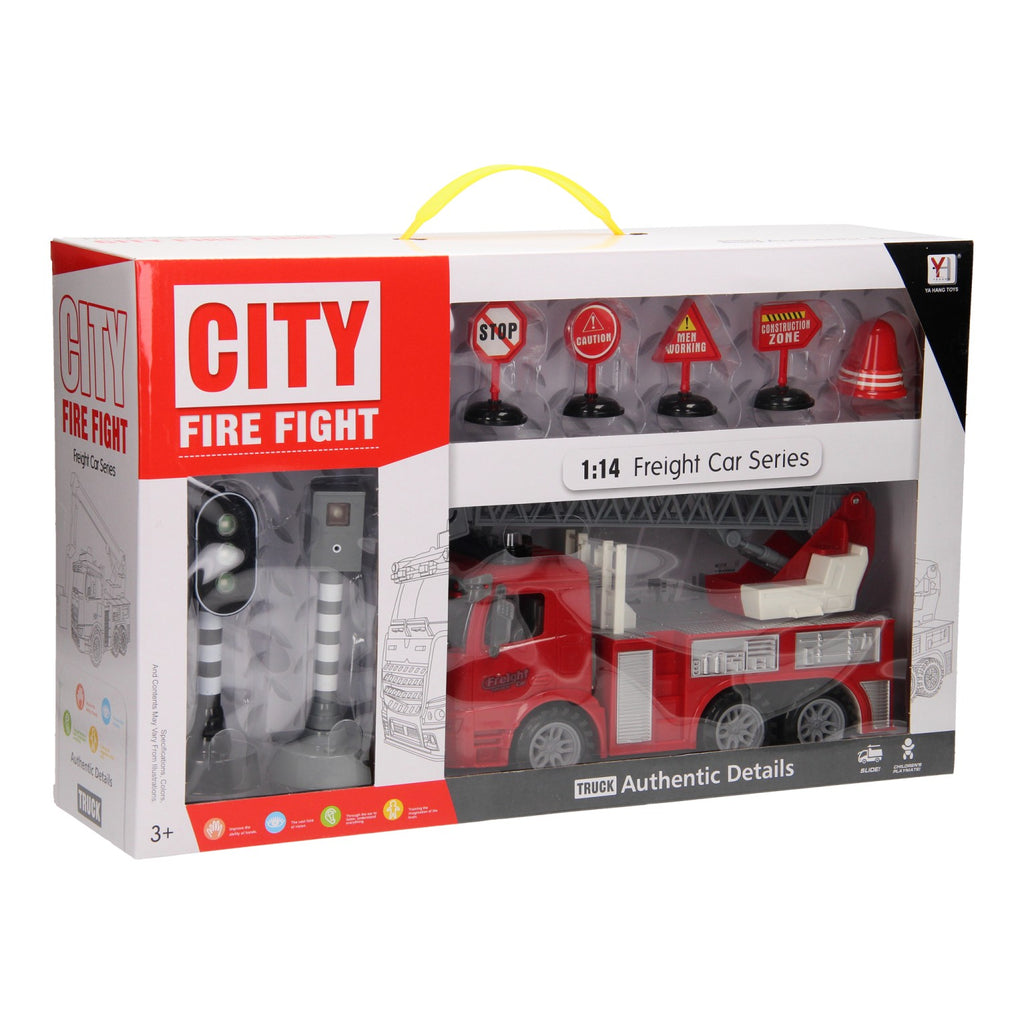 Met deze gave brandweer speelset kun jij je helemaal wanen in het leven van een echte brandweerman! Rijd rond met de brandweerwagen, plaats de verkeersborden om mensen veilig te houden. Je kunt ook het stoplicht en de flitspaal gebruiken om iedereen in het gareel te houden. De uitschuifbare ladder van de vrachtwagen zorgt ervoor dat je ook hoog in een gebouw kunt blussen en mensen kunt redden. De flitspaal, het stoplicht en de brandweerwagen hebben geluidseffecten voor een extra beleving!