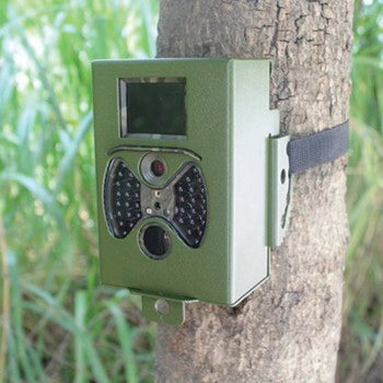 - Montagemogelijkheden: behuizing kan op een boom/muur bevestigd worden d.m.v. lange schroeven, een bevestigingsband of door het statief van de camera