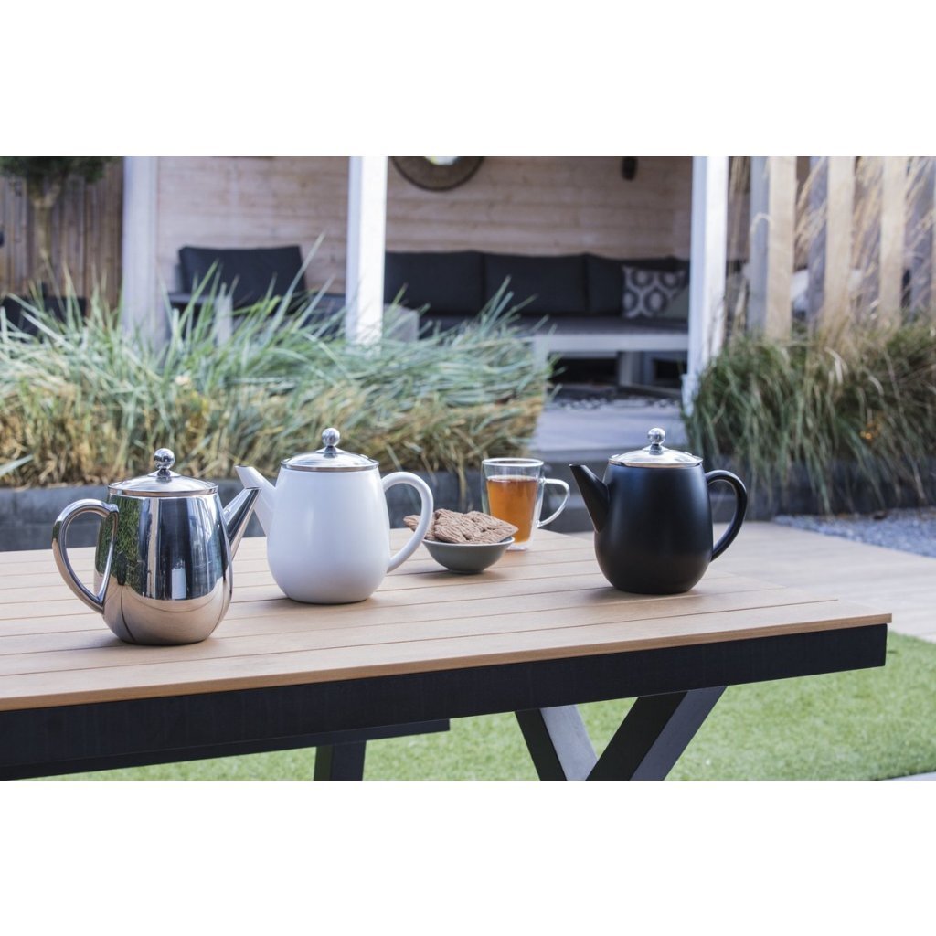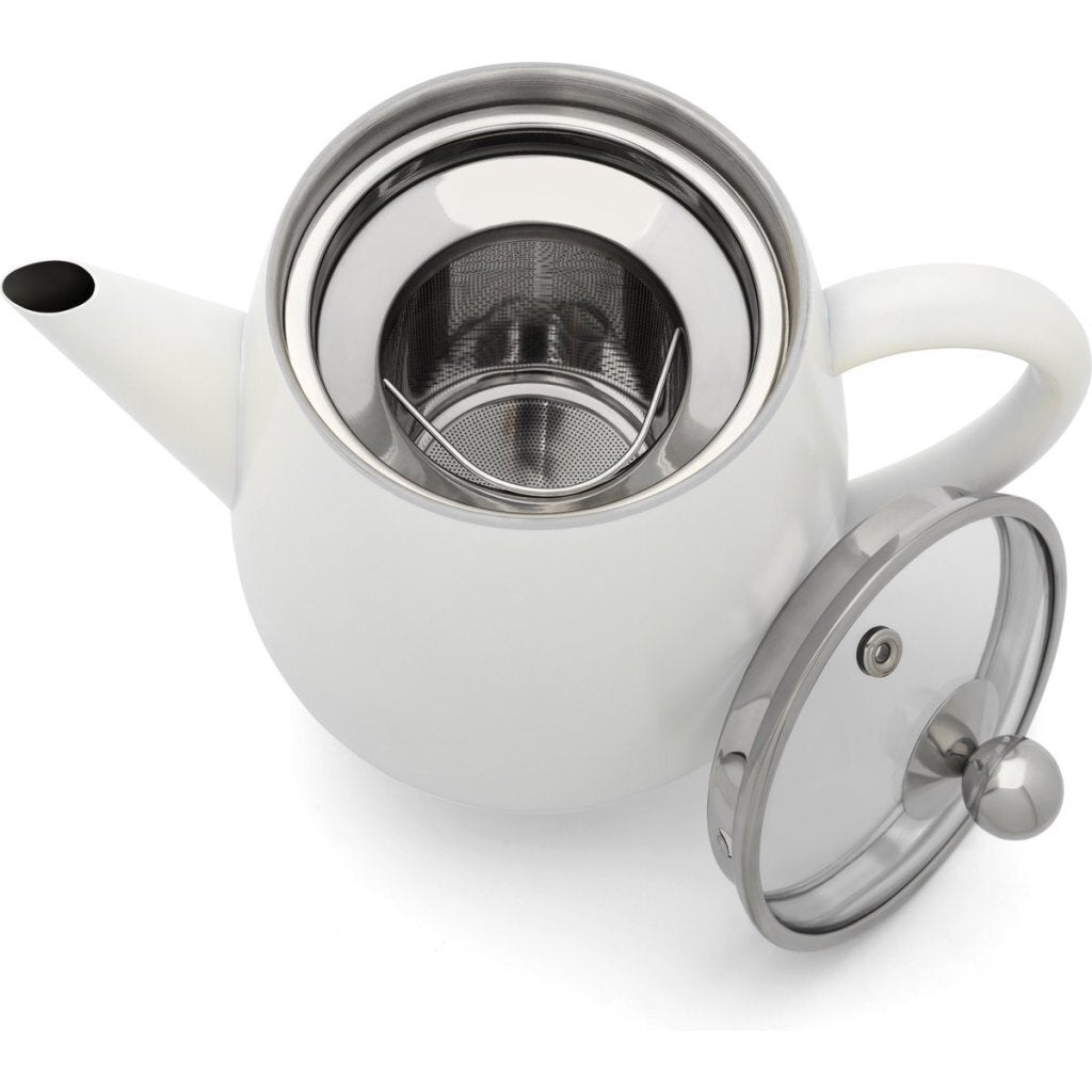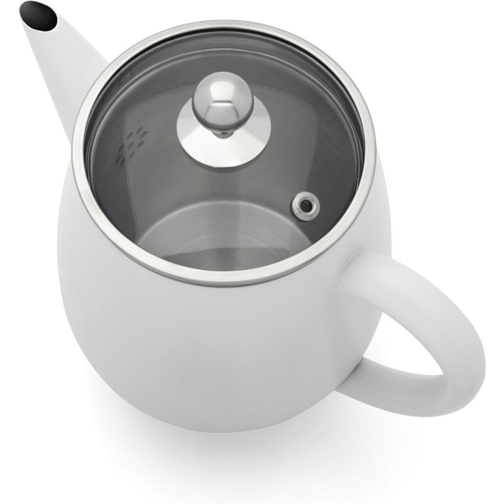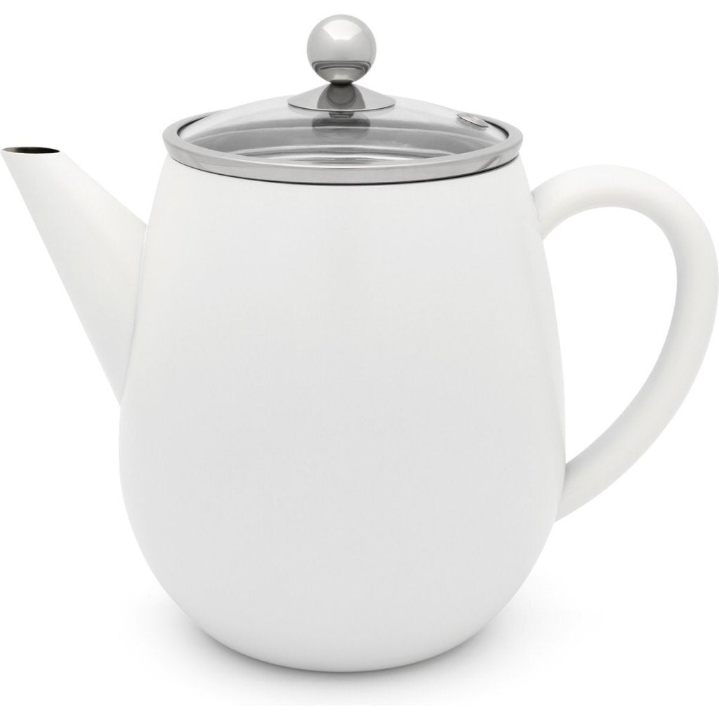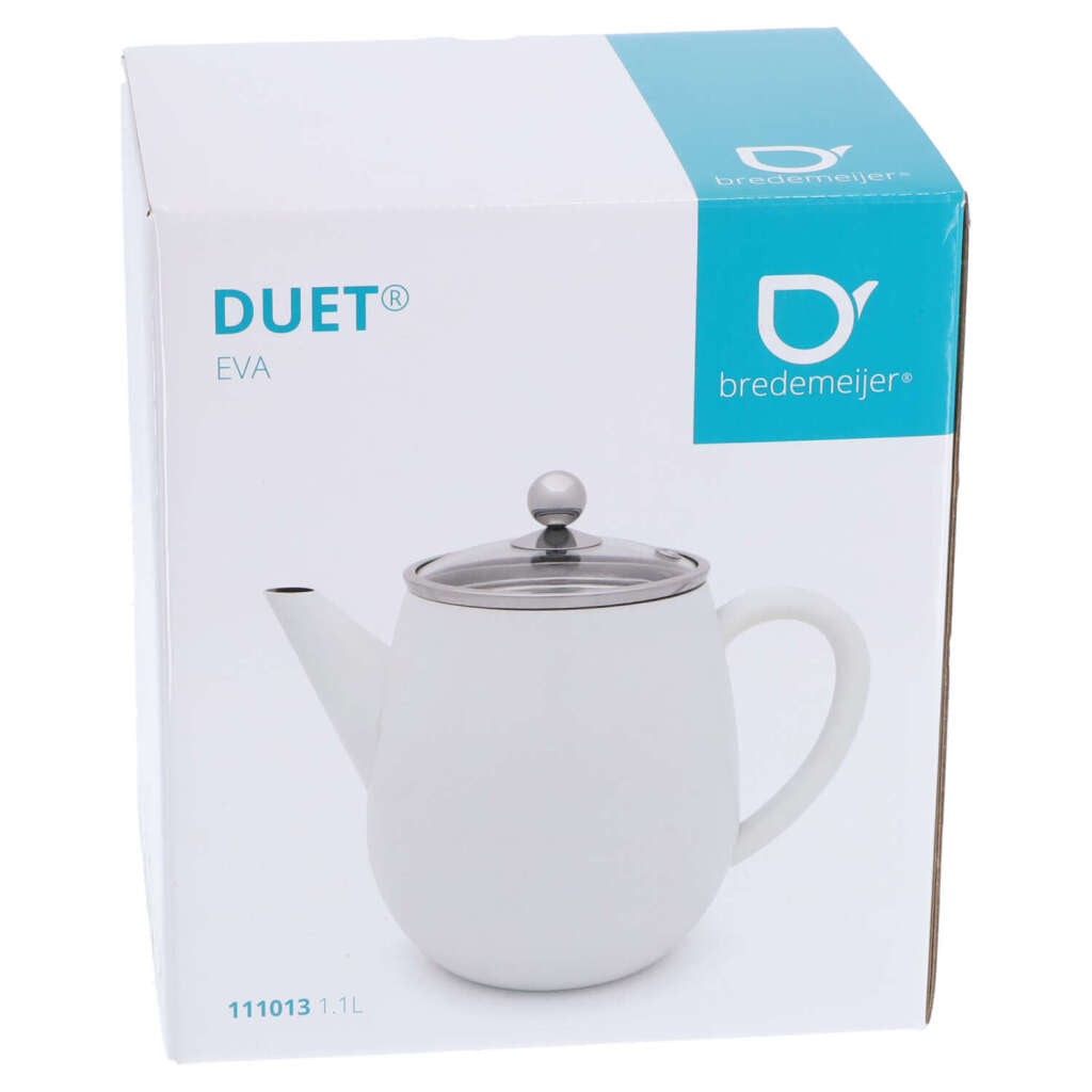 Bredemeijer Duet Eva witte theepot met elegante uitstraling en glazen deksel. Met dubbele isolerende wand. De Thee blijft daardoor drie kwartier tot een uur lang op temperatuur en smaak (indien de theepot minimaal tot 90% gevuld is).Inhoud: 1,1 liter.