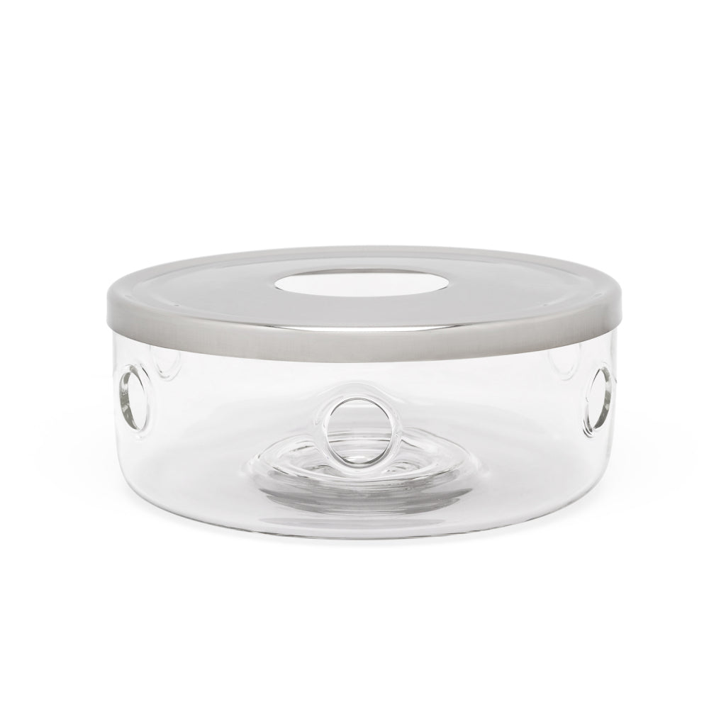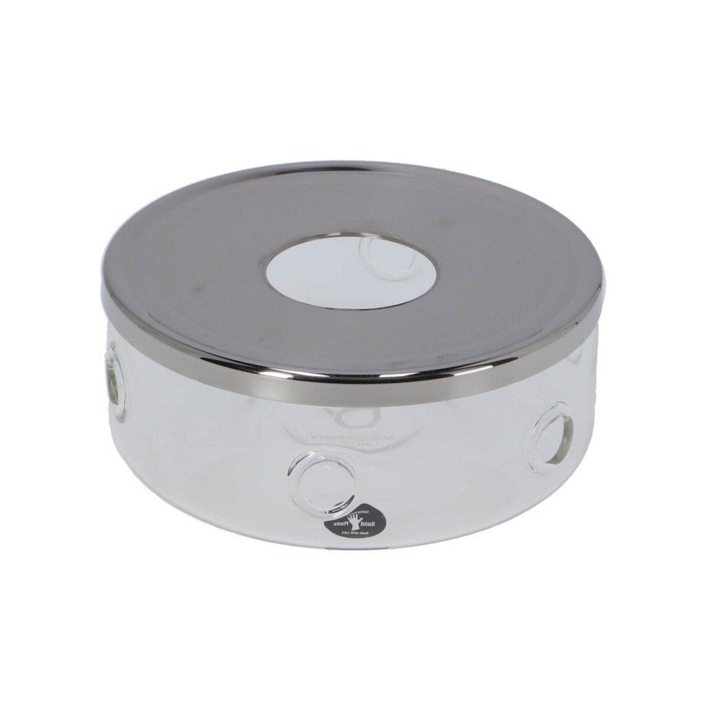 Glazen theelicht van hittebestendig glas dat perect pas bij de Glazen Minuet Santhee van Bredemeijer.De bovenzijde is vervaardigd uit roestvrijstaal.
