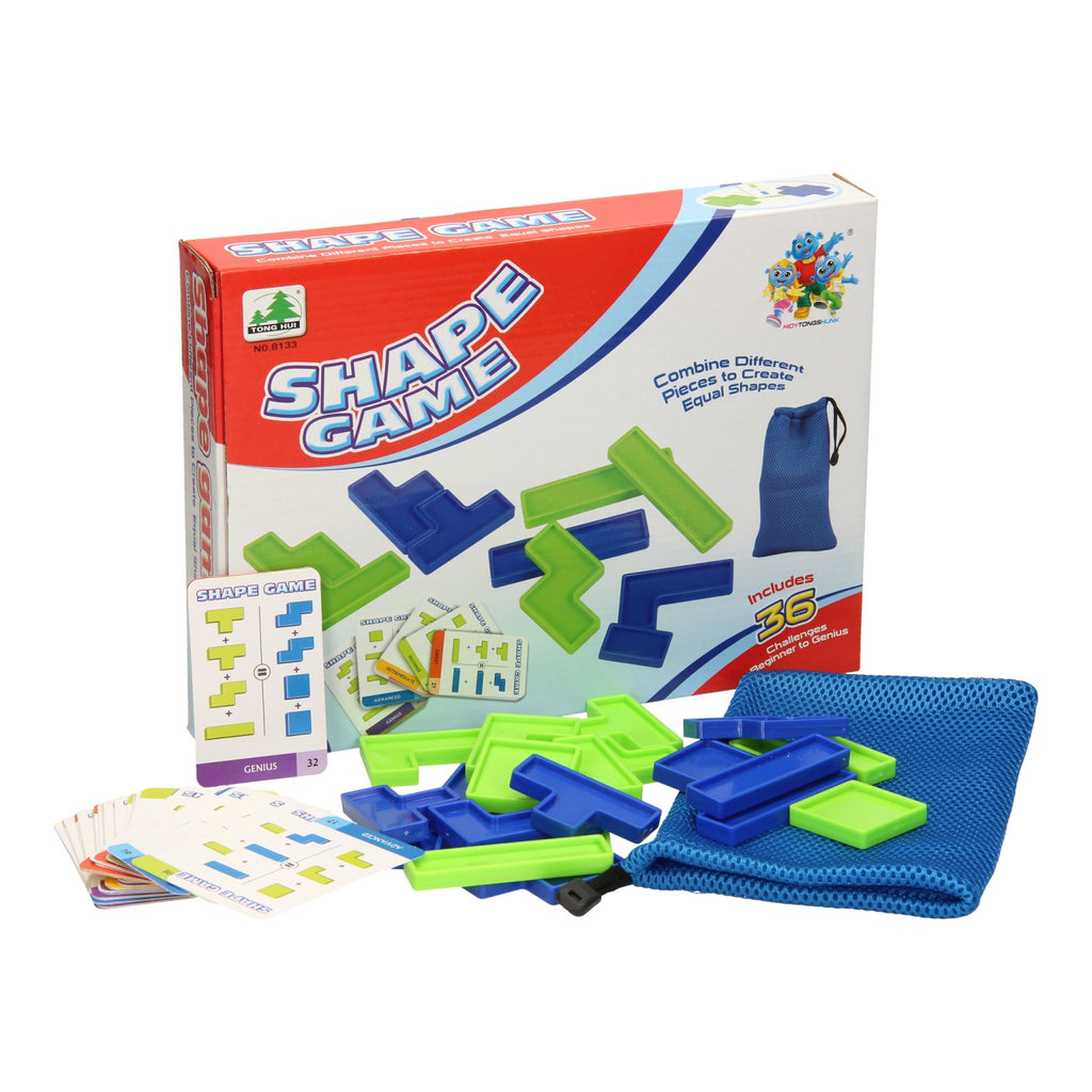 Leg uitdagende patronen met Vormen Puzzel Spel! In de doos zitten 10 blauwe puzzelstukken, 10 groene puzzelstukken, 36 kaarten met uitdagende opdrachten en oplossingen, die je in een handige opbergzak kunt bewaren. De uitdagingen van deze breinbreker verschillen in niveau. Zo kunnen zowel beginners als experts aan de slag met Het Vormen Puzzel Spel. Het logische denkspel stimuleert het ruimtelijk inzicht van kinderen vanaf 3 jaar.