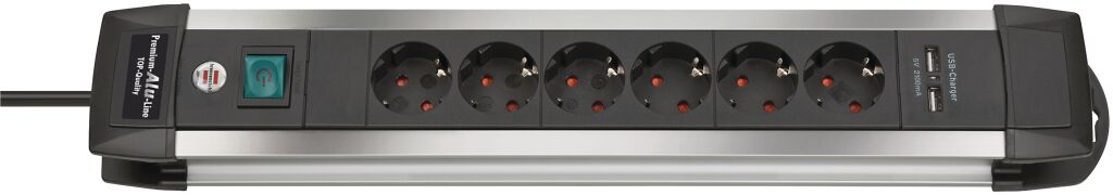 Premium-Alu-Line stekkerdoos met USB. Tijdloos design met een stabiele behuizing gemaakt van aluminium met mat afgewerkte bovenzijden die ongevoelig zijn voor electromagnetische golven. Extra zware kwaliteit voor een betere stabiliteit. De overtollige kabel blijft opgeborgen. Veiligheidsstopcontacten in 45° stand, ook voor haakse stekkers. Verlichte veiligheidsschakelaar, tweepolig in-/uitschakelbaar. Voorzien van montagegaten. 2 USB-laadaansluitingen. Laadstroom van max. 2100 mA, voor snel laadproces. Stopcontacten met kinderbeveiliging. Met banderol. Kabel lengte: 3 m. Kabel benaming: H05VV-F 3G1,5. Lengte ca.: 50 cm. Stopcontacten: 6. USB-aansluitingen: 2. Stekkersysteem: DE.