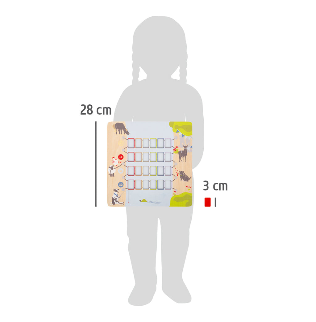 Elk van de dieren vertegenwoordigt een kleur en heeft zijn eigen speciale voetafdruk, zodat ze kunnen worden toegewezen aan hun respectievelijke startplaatsen. Naast het spelplezier leren kinderen tegelijkertijd ook welk dier welke voetafdruk heeft. Dit spel heeft drie variaties die je kunt spelen die werken zonder te tellen, zodat het ook geschikt is voor jongere spelers. De uitsparingen in het speelveld zorgen ervoor dat de brugstukken op hun plaats blijven en niet wegschuiven.