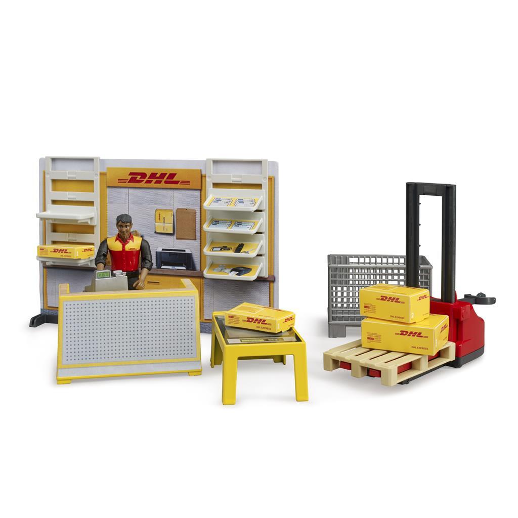 DHL is een van 's werelds toonaangevende logistieke dienstverleners.Het biedt zijn klanten een breed scala aan verzenddiensten in de DHL-vestigingen.Bij Bruder is er nu ook de DHL-vestiging met uitrusting en figuur.Pakketten kunnen hier worden opgehaald en afgezet, verzenddozen kunnen worden gekocht en er kunnen ook andere diensten worden gebruikt.De medewerker in de set helpt u graag verder met eventuele vragen.De DHL Store is de perfecte aanvulling op onze nieuwe DHL Sprinter (art.nr. 02671) En natuurlijk is de DHL Shop goed te combineren met de andere bworld themasets. Geschikt voor kinderen vanaf 4 jaar.