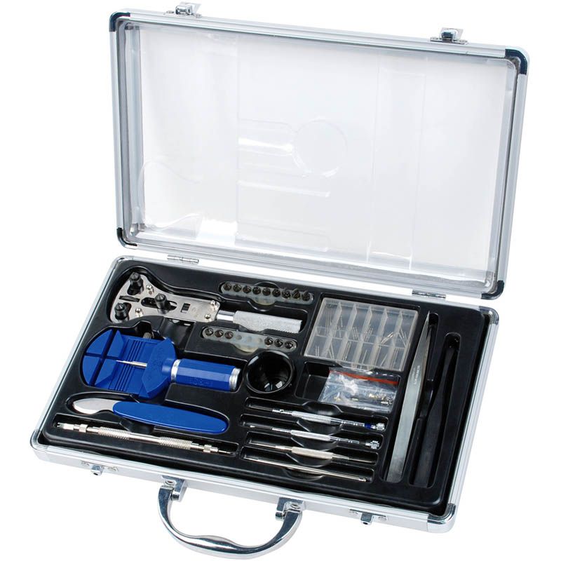 - Compete set gereedschap voor de meest voorkomende werkzaamheden aan en onderhoud van horloges, uurwerken, horlogebanden en sieraden.