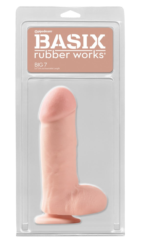 Natuurlijke dildo Big 7" van Basic Rubber Works met geprononceerde eikel, adering en testikels. De zuigvoet zorgt voor handsfree rijplezier. Natuurlijk is de dildo ook compatibel met strap-ons.