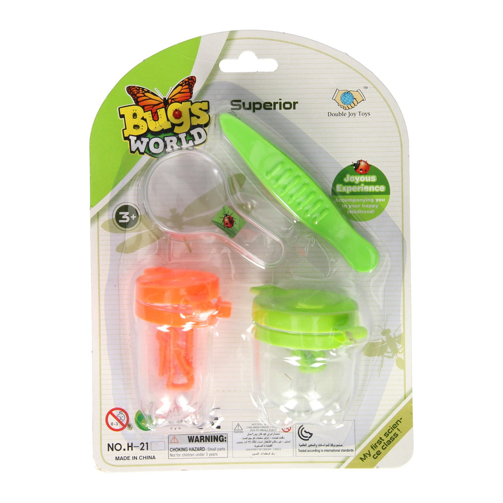 Vang een insect en bekijk deze door het vergrootglas heen in een van de twee potjes. Geschikt voor kinderen vanaf 3 jaar.