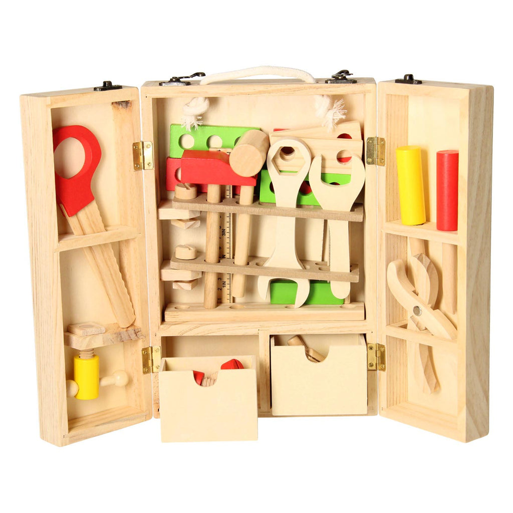 Met deze Buurman & Buurman kluskoffer kan je timmeren, zagen, schroeven en sleutelen! Zet met je eigen kluskoffer de leukste figuurtjes in elkaar. Een vliegtuig, een windmolen, een giraffe of laat je eigen fantasie de vrije loop. In deze kluskoffer zitten schroevendraaiers, schroeven, een zaag, een nijptang, dopsleutel, meetlat, hamer en verschillende onderdelen die aan elkaar bevestigd kunnen worden. Alle onderdelen zijn volledig van hout gemaakt.