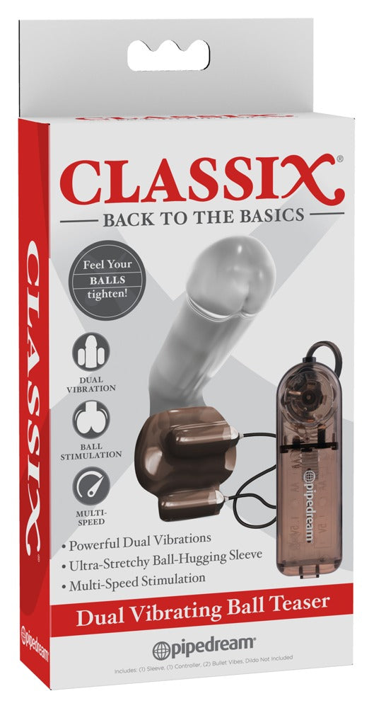 Dotted sleeve for the testicles with spaces for the included vibro-bullets. The multi-speed vibration can be adjusted with the remote control. Please order batteries separately: 2 x AA.