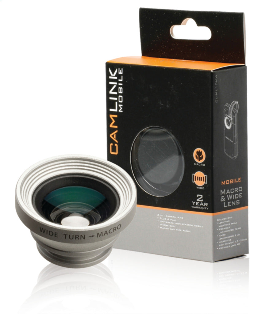 Bevestig de 2-in-1-lens aan uw mobiele telefoon of tablet om extra camera-effecten toe te voegen. De lens is onderdeel van een complete set, inclusief lensdop en reiszak.