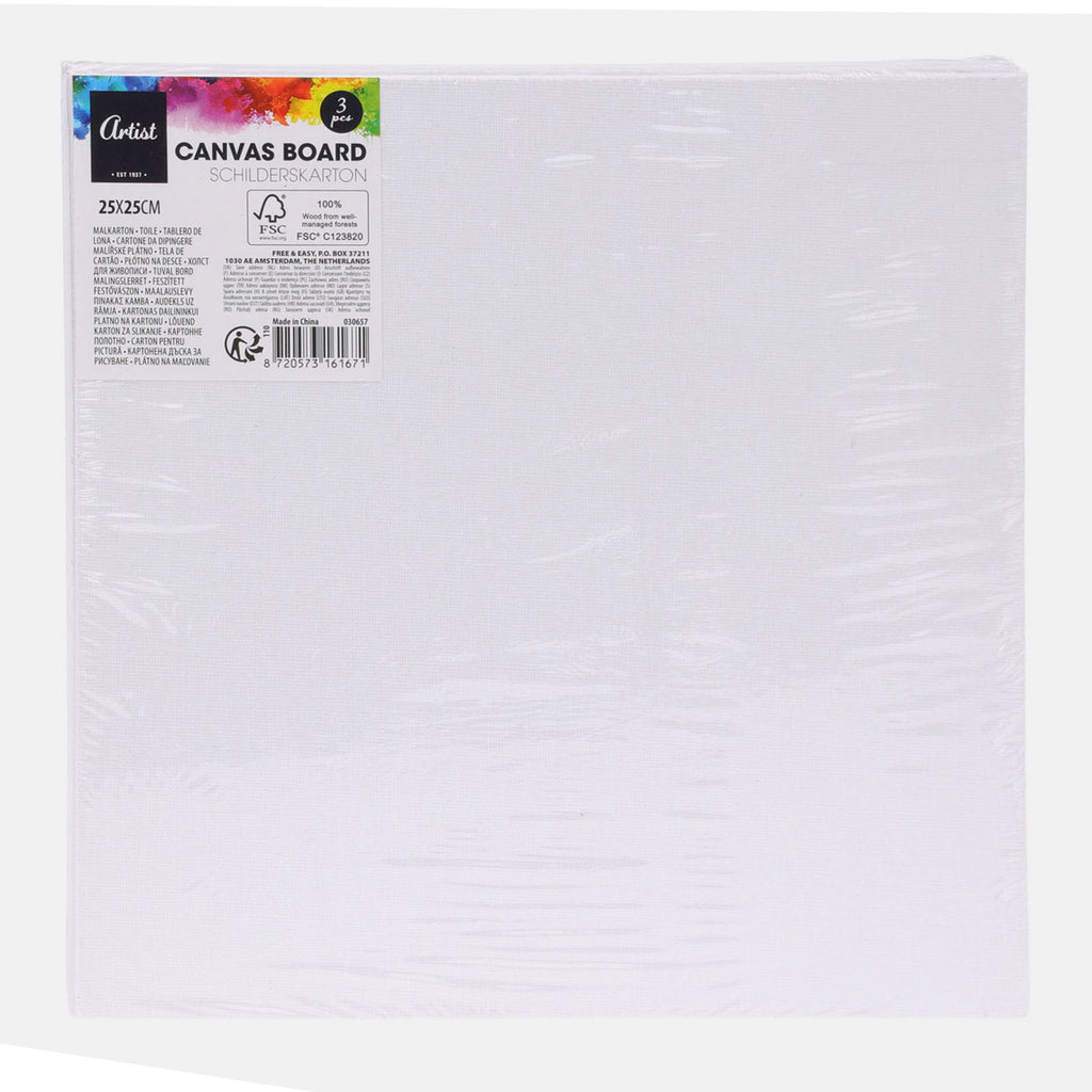 Set van 3 vierkante panelen om te beschilderen. De canvassen zijn 25 x 25 centimeter groot.