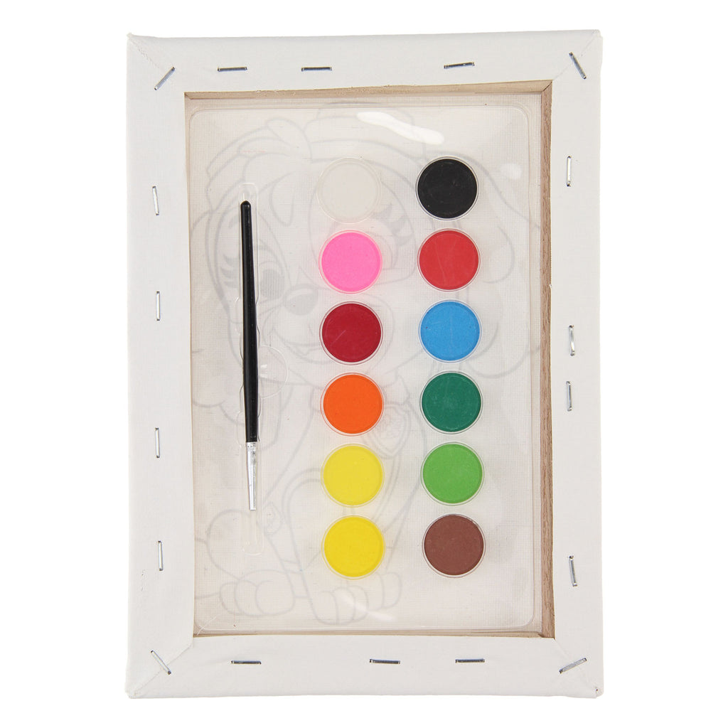 Canvas met afbeelding van een PAW Patrol karakter om zelf te schilderen. Inhoud: 1 canvas, 12 kleuren waterverf en een penseel. Afmetingen canvas: 25 bij 18 bij 1,5 centimeter.