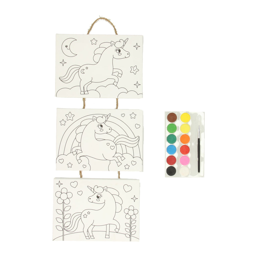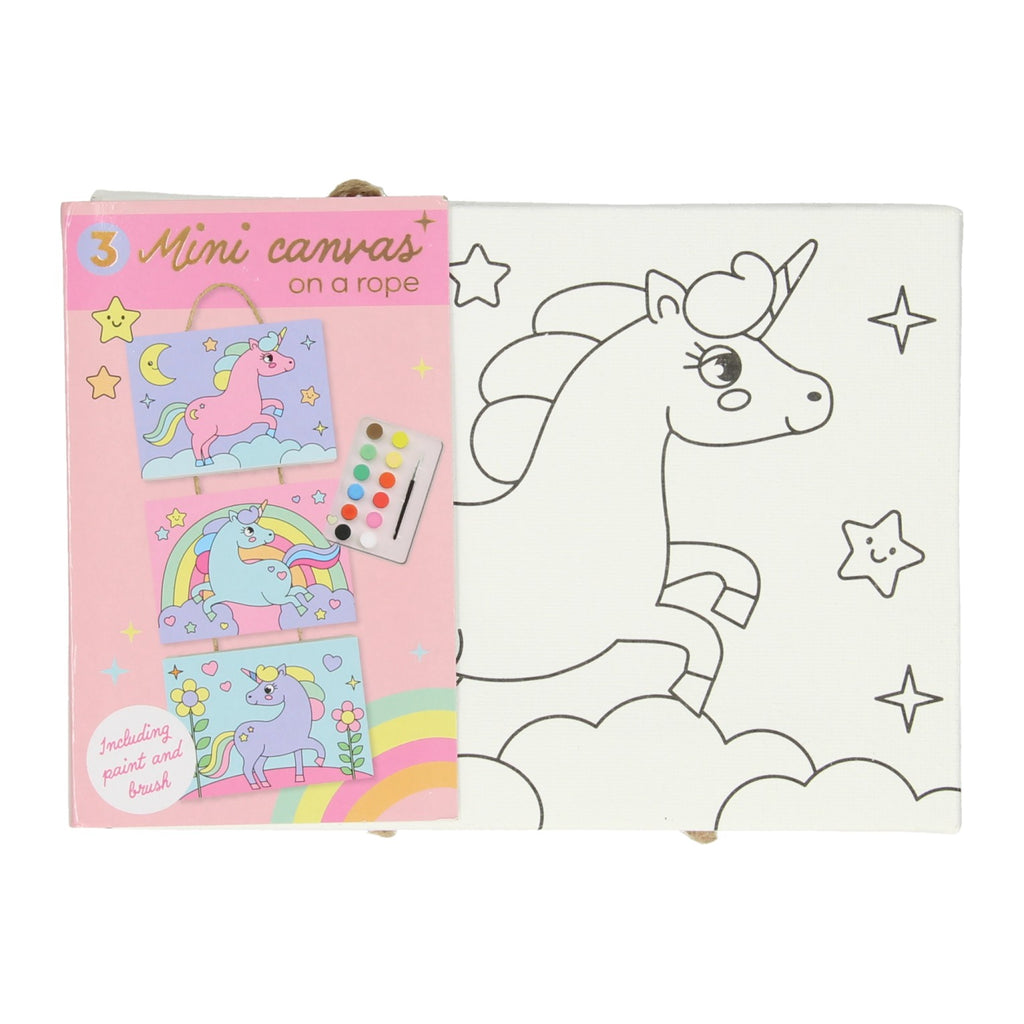 Set van 3 mini canvassen aan touw. Inclusief verf en penseel. Variant: eenhoorn. Afmetingen: 17,5 x 12,5 centimeter. Geschikt voor kinderen vanaf 3 jaar oud.