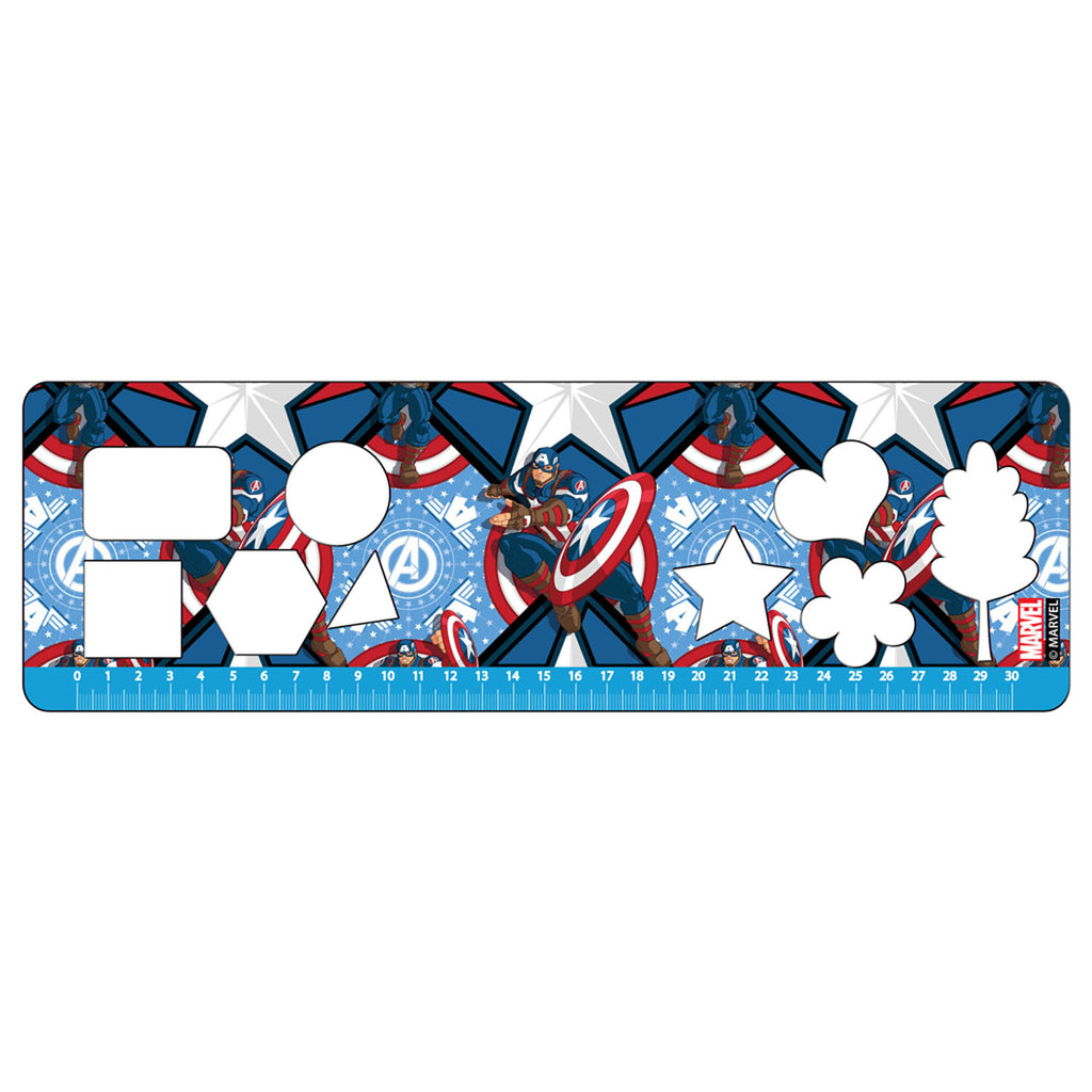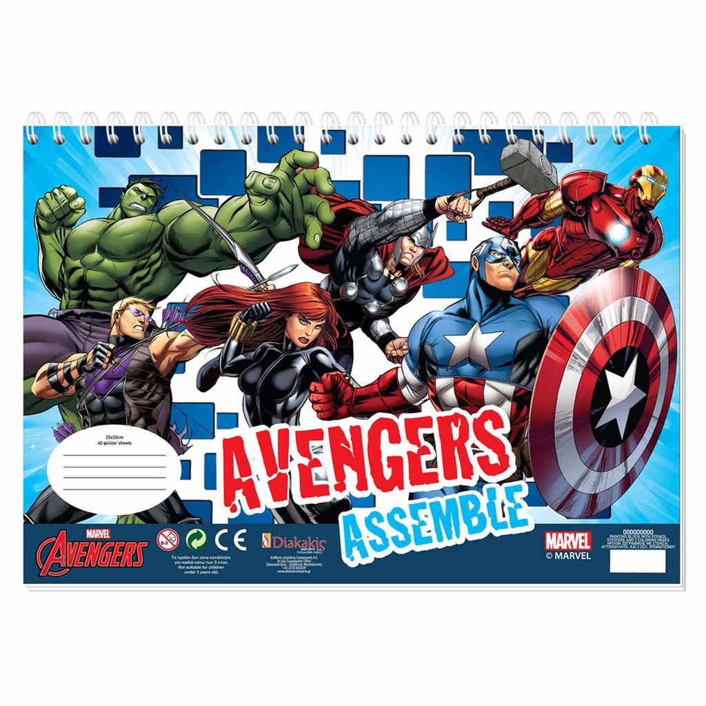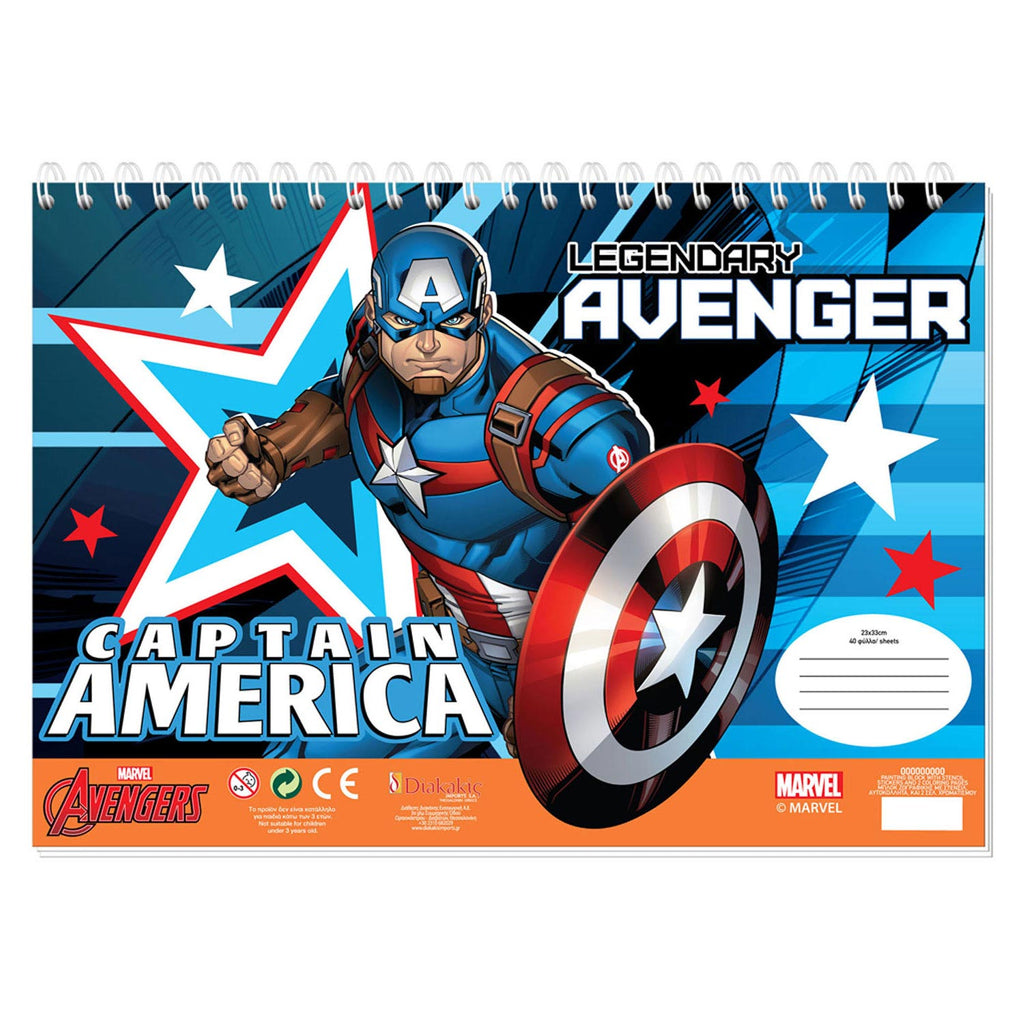 Schilder of kleur deze tekeningen van Captain America. Plak de verschillende stickers op de tekeningen. Aan de buitenkant van het schetsblok zit een liniaal van 30 centimeter lang, en uitsparingen in verschillende vormen, zoals een hartje, boom en vierkant, die je na kunt trekken met een stift of potlood. Het schetsboek is 33 bij 23 centimeter. Inclusief stickers en liniaal.