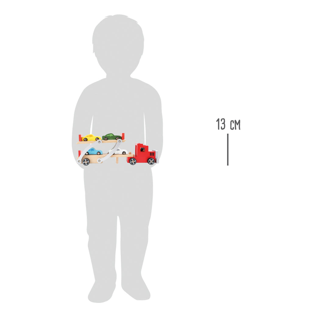 Attentie, hier wordt zwaar geladen! Om de nieuwe automodellen van A naar B te brengen, is dit transportvoertuig perfect. Er kunnen vier auto's op geplaatst worden. Door de kantelbare laadvloer kunnen de houten auto´s makkelijk de vrachtauto op rijden. De aanhanger kan losgekoppeld worden van de vrachtauto.