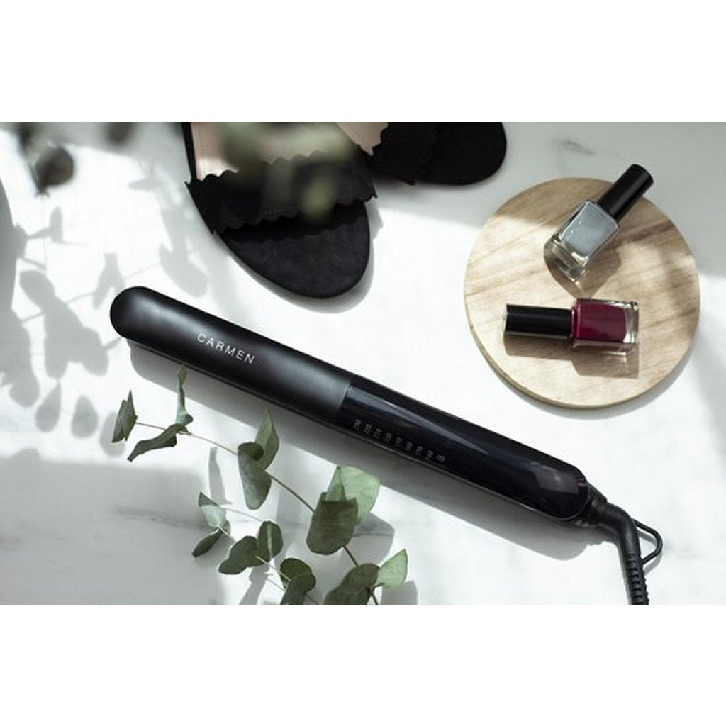 Carmen Temperature Control Titanium heeft een mooi, ergonomisch design en ligt prettig in de hand. De extra lange platen van titanium zijn maar liefst 120 mm lang. Dus als u in het trotse bezit bent van mooi, lang haar is deze Temperature Control Titanium Straightener voor u de allerbeste optie. De nieuwe Carmen Temperature Control Titanium heeft een handig, extra lang, meedraaibare snoer van 180 cm.