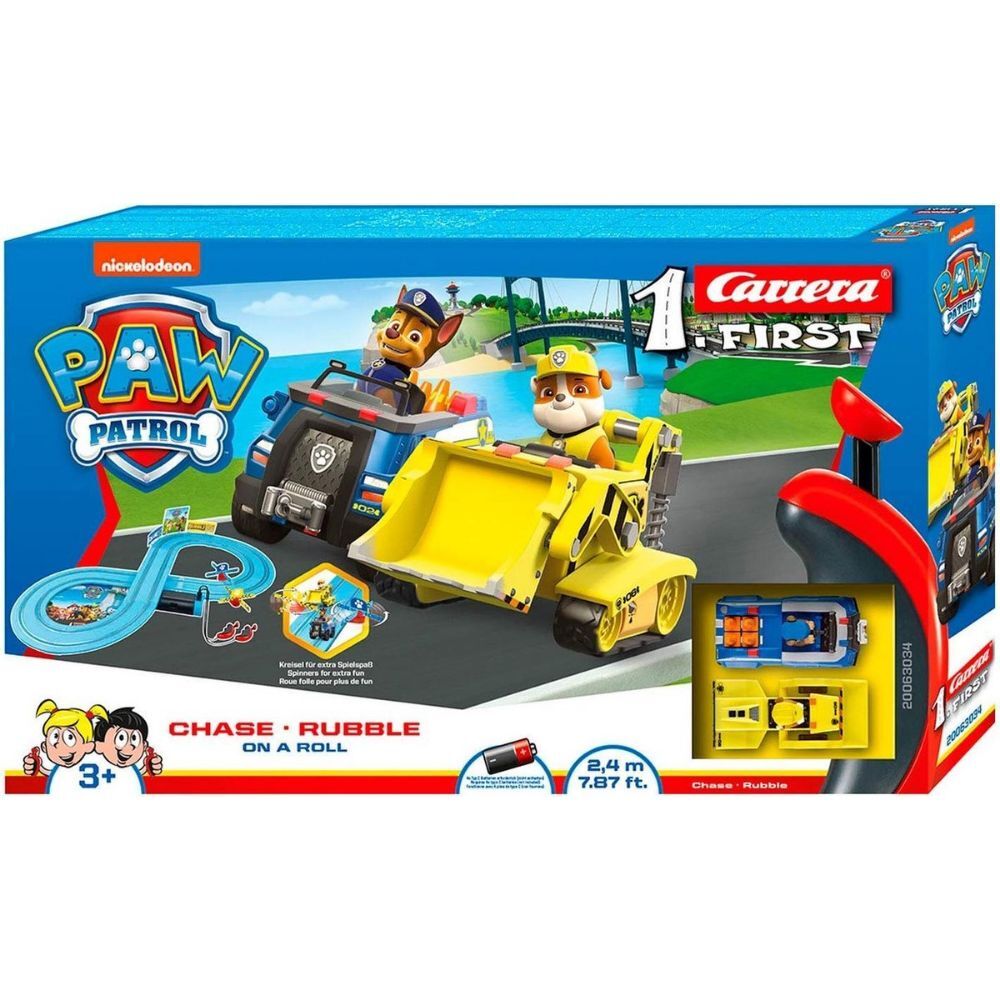Carrera First Paw Patrol On The Roll racebaan met Chase met zijn politiewagen en Rubble met zijn kraanwagen. De lengte van de racebaan is 240 cm. Geschikt voor kinderen vanaf 3 jaar.